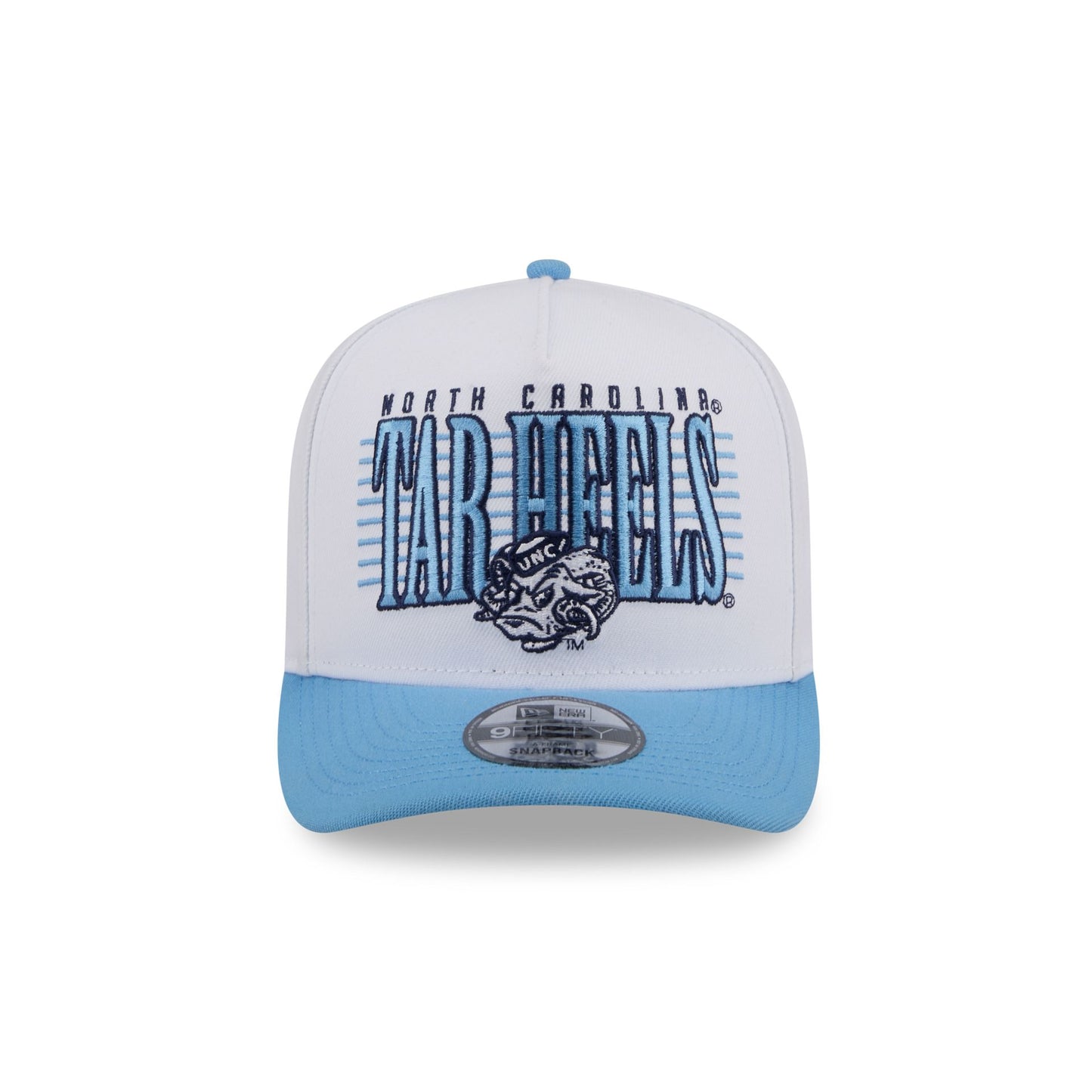 The North Carolina Tar Heels March Madness College Vault White 9FIFTY A-Frame Snapback features an embroidered Tar Heels College Vault wordmark and logo at the front panel with an adjustable snapback closure at the rear. Additional details include a 1982 NCAA Final Four patch at the right-wear side with a blue visor and a green undervisor.