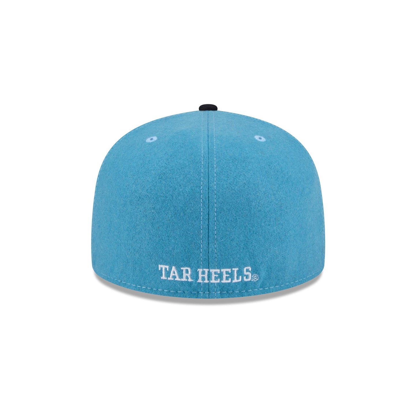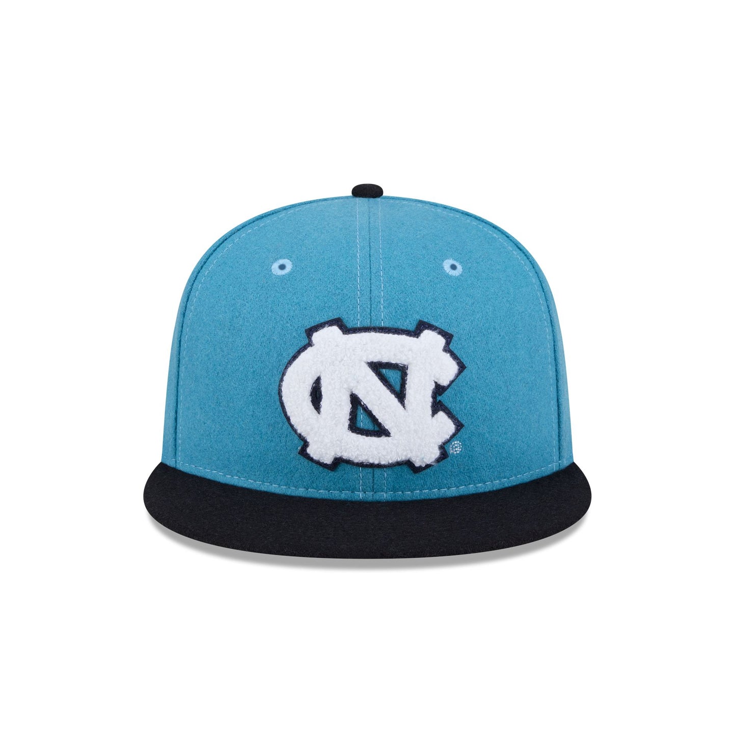 The North Carolina Tar Heels Melton Wool 59FIFTY Fitted Cap features a chenille applique Tar Heels logo patch at the front panels with an embroidered team wordmark at the rear and a gray undervisor.