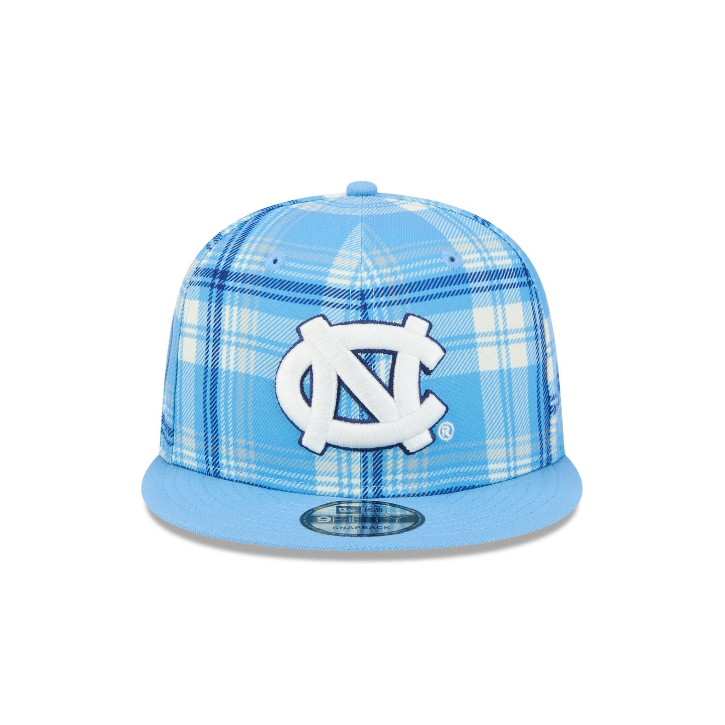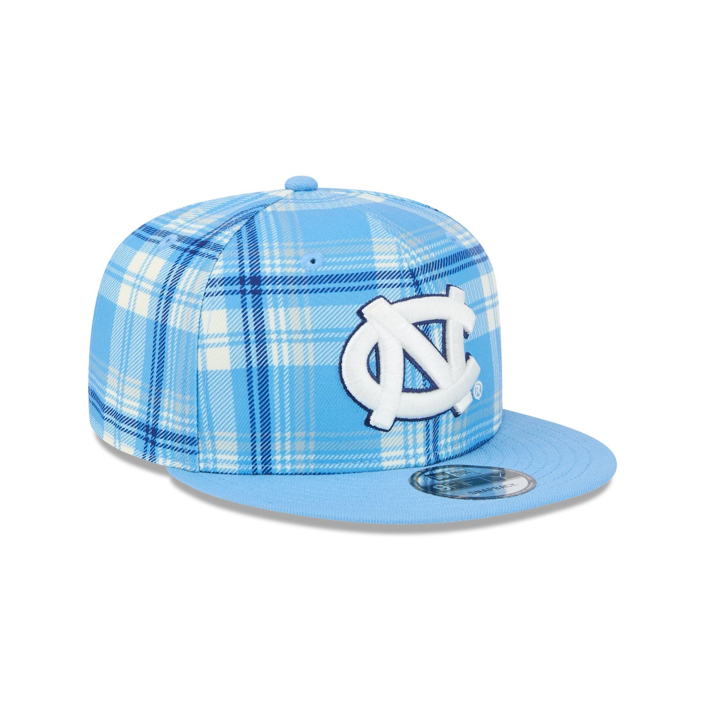The North Carolina University Tar Heels Plaid 9FIFTY Snapback features an embroidered Tar Heels logo at the front panels against a matching plaid pattern. Additional details include a team logo above a snapback closure at the rear and a gray undervisor.