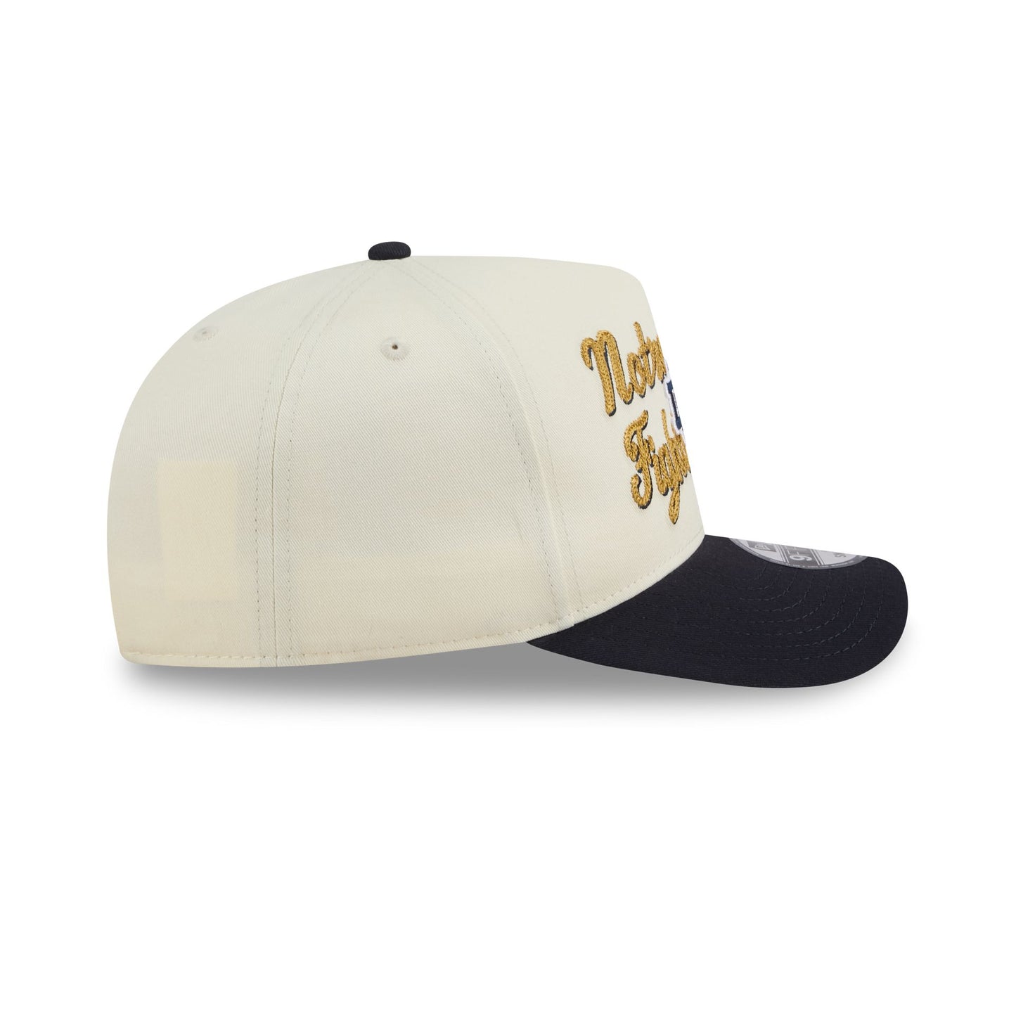 The Notre Dame Fighting Irish Chainstitch 9FIFTY A-Frame Snapback features a chainstitch Fighting Irish logo and script wordmark at the front panels with a snapback closure at the rear and a gray undervisor.