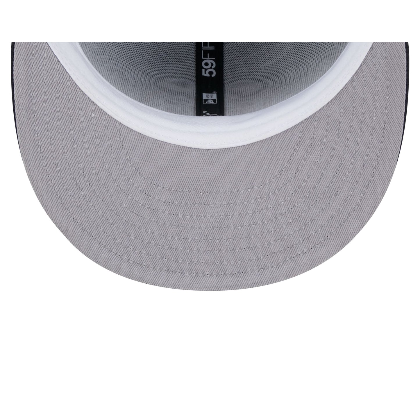 The Notre Dame Fighting Irish Navy 59FIFTY Fitted Cap features an embroidered Fighting Irish logo at the front panels with a matching team wordmark at the rear and a gray undervisor.
