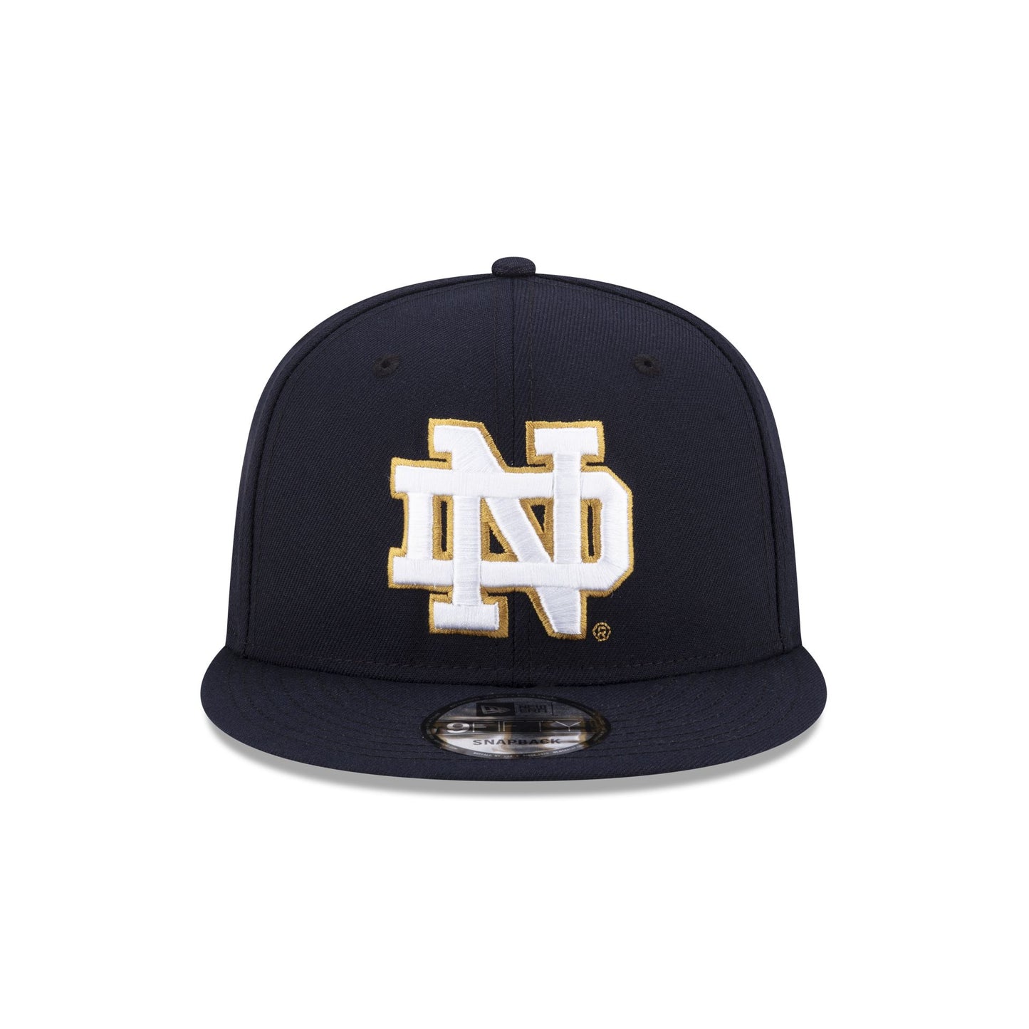The Notre Dame Fighting Irish Navy 9FIFTY Snapback features an embroidered Notre Dame logo at the front panels with a snapback closure at the rear and a gray undervisor.