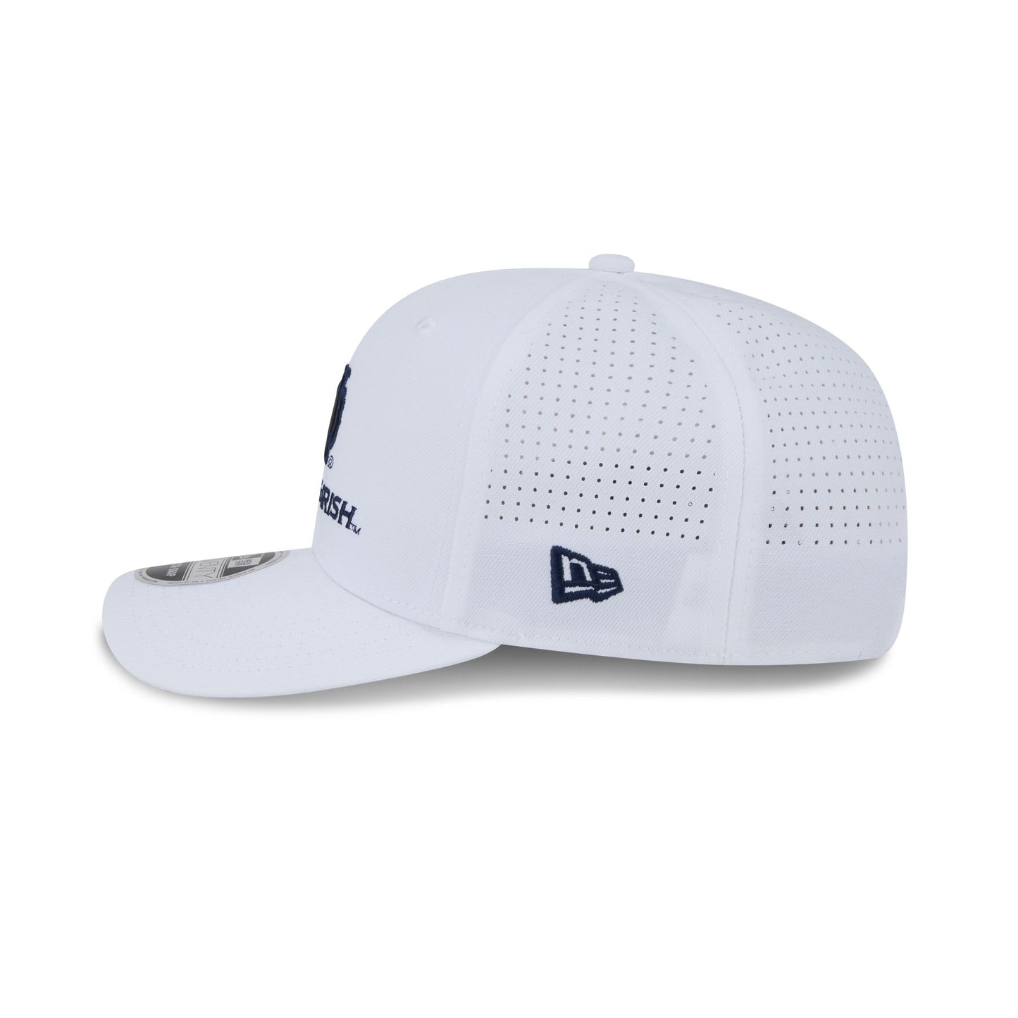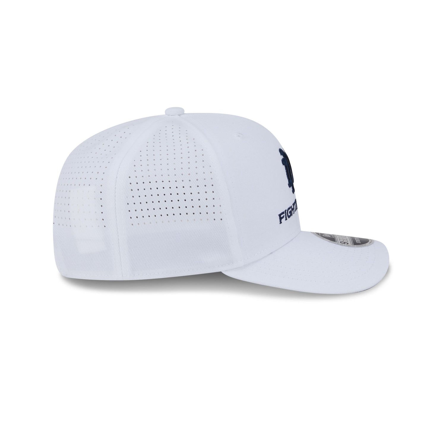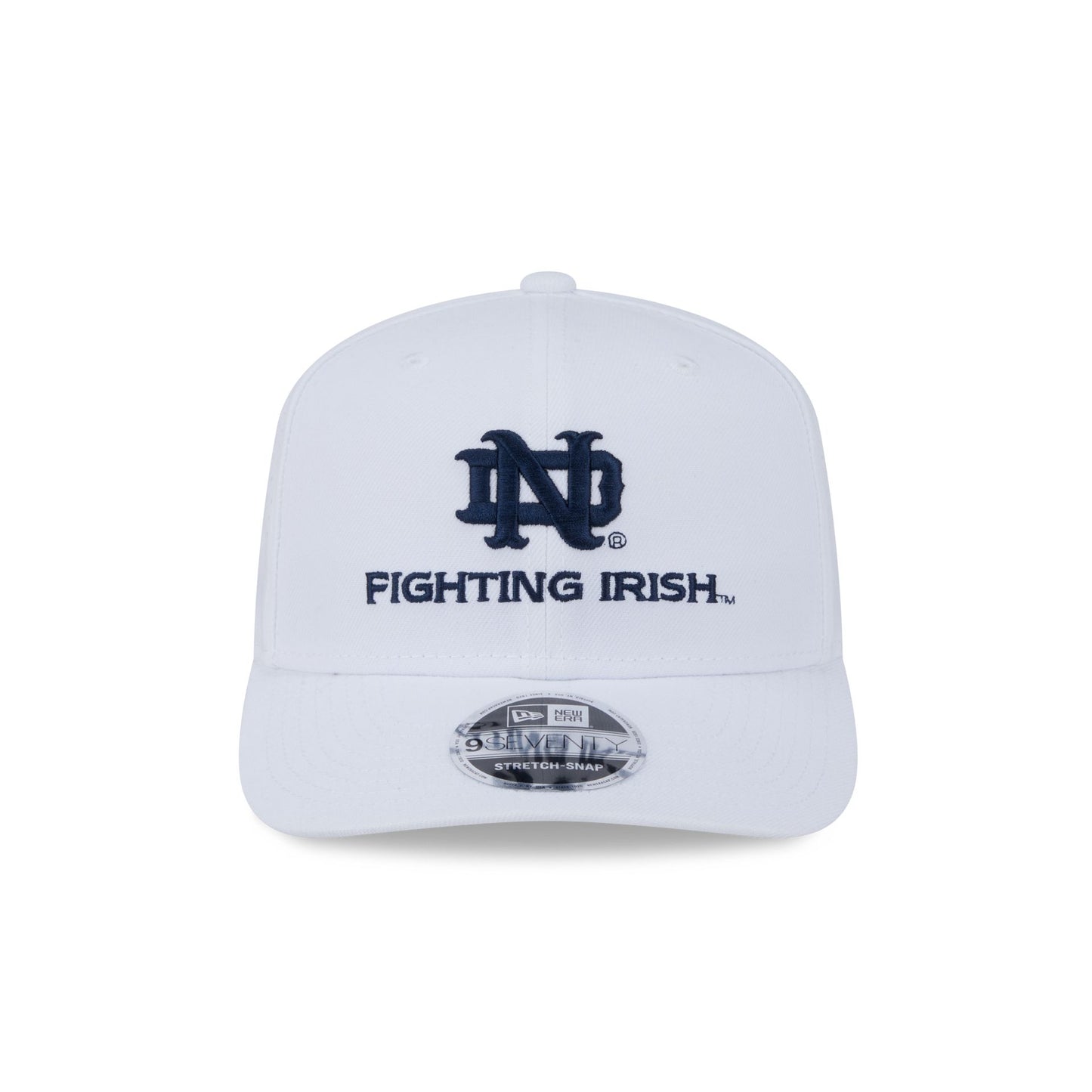 The Notre Dame Fighting Irish Optic White Performance Stacked 9SEVENTY Stretch-Snap features an embroidered Fighting Irish logo at the front panels with an adjustable stretch-snap closure at a performance mesh rear.