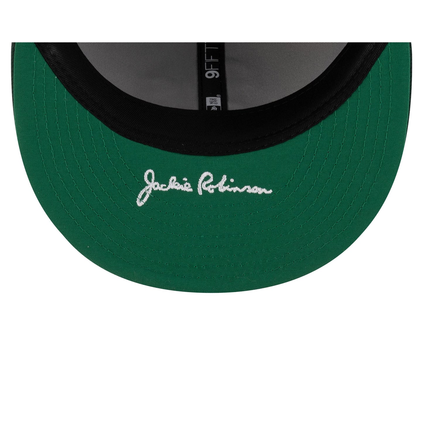 The Athletics Jackie Robinson Day 2025 Retro Crown 9FIFTY Snapback features an embroidered Athletics logo at the front panels with an MLB Batterman logo above a snapback closure at the rear. Additional details include a Jackie Robinson pin at the left panel and Robinson's embroidered signature on a green undervisor.