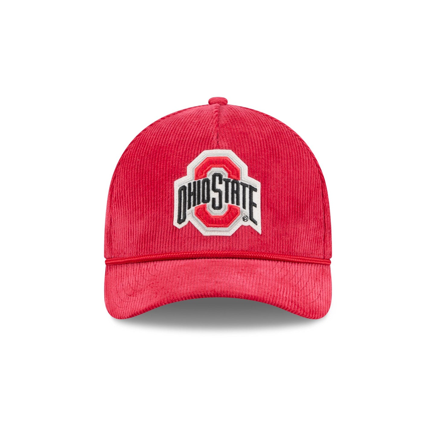 The Ohio State Buckeyes Corduroy 9FORTY M-Crown A-Frame Snapback features an embroidered Buckeyes logo at the front panels with a corduroy fabrication throughout and a rope at the visor. Additional details include a snapback closure at the rear and a gray undervisor.