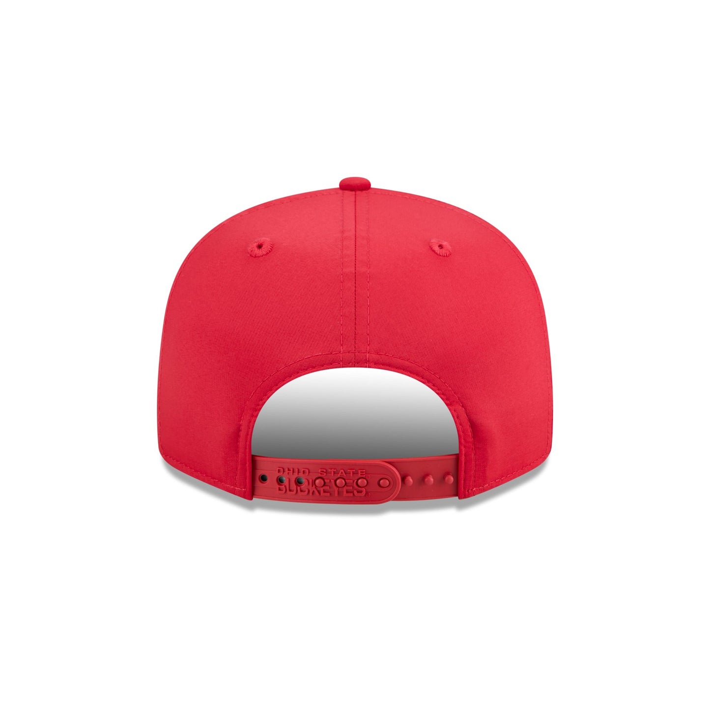 The Ohio State Buckeyes Hot Weather Split Panel 9FIFTY Snapback features a sewn-down silicone Buckeyes logo patch at the front panels with a split-crown construction featuring water-repellent quill tech fabrication. Additional details include a team wordmark at a soft silicone snapback closure at the rear with a quick-dry cushioned sweatband to absorb moisture and team color silicone transfer details at the undervisor.