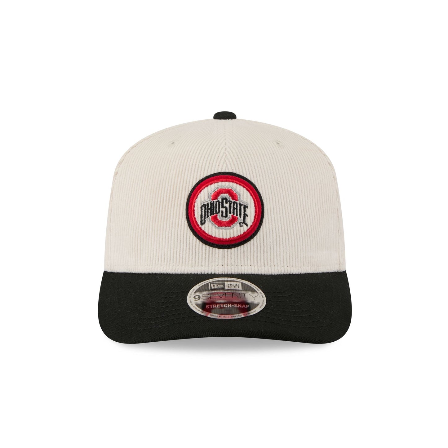 The Ohio State Buckeyes Loyal Corduroy 9SEVENTY Stretch-Snap features an embroidered Buckeyes logo at the front panels against a corduroy fabrication throughout the cap. Additional details include an alternate logo at the right-wear side with an adjustable stretch-snap closure at the rear.