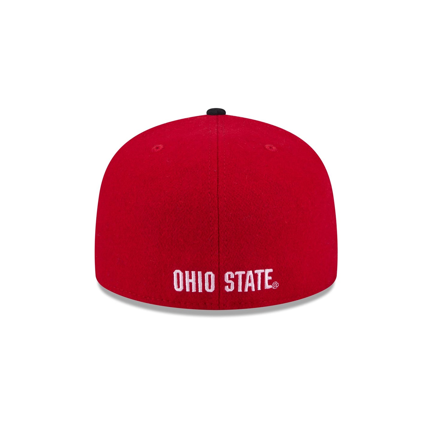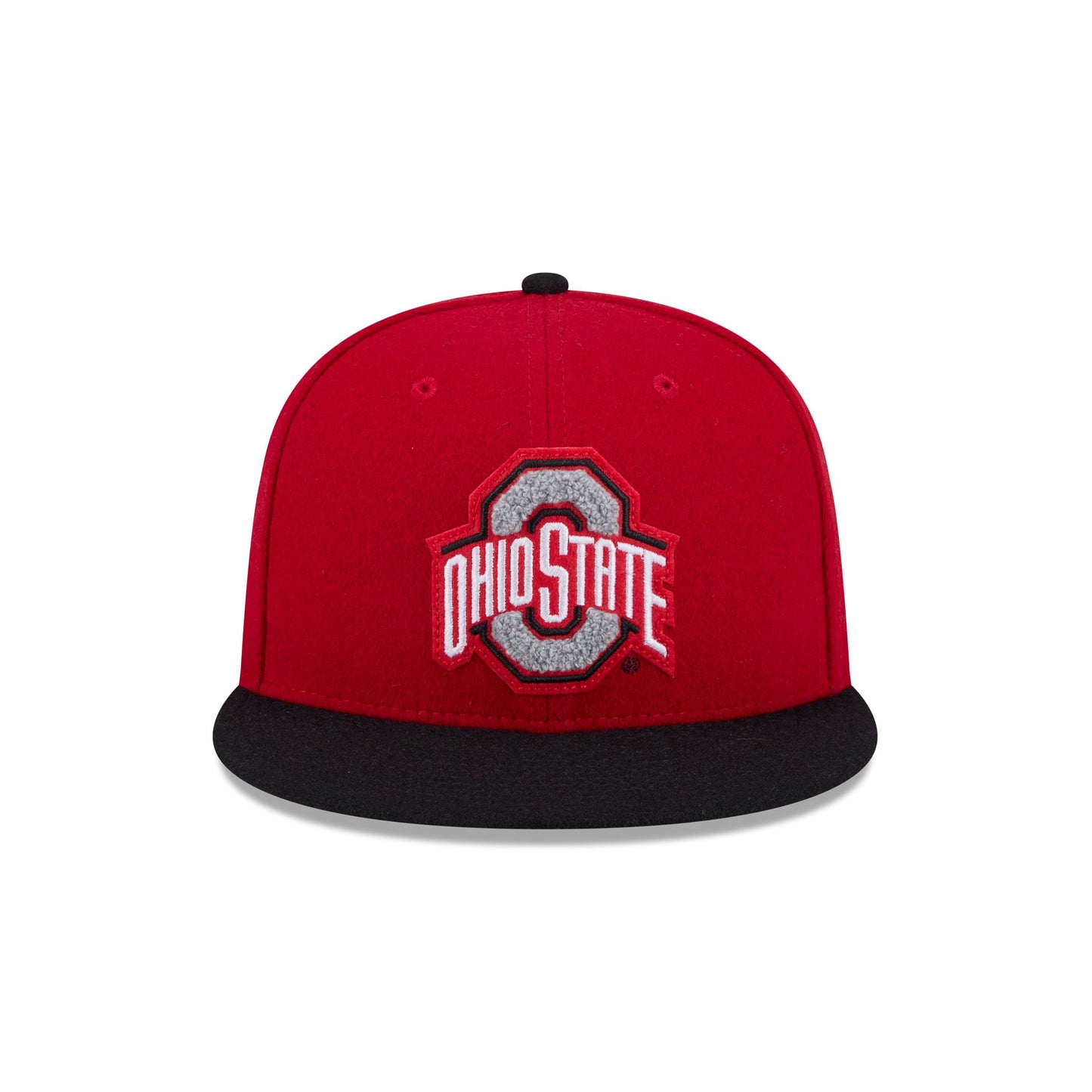 The Ohio State Buckeyes Melton Wool 59FIFTY Fitted Cap features a chenille applique Buckeyes logo patch at the front panels with an embroidered team wordmark at the rear and a gray undervisor.