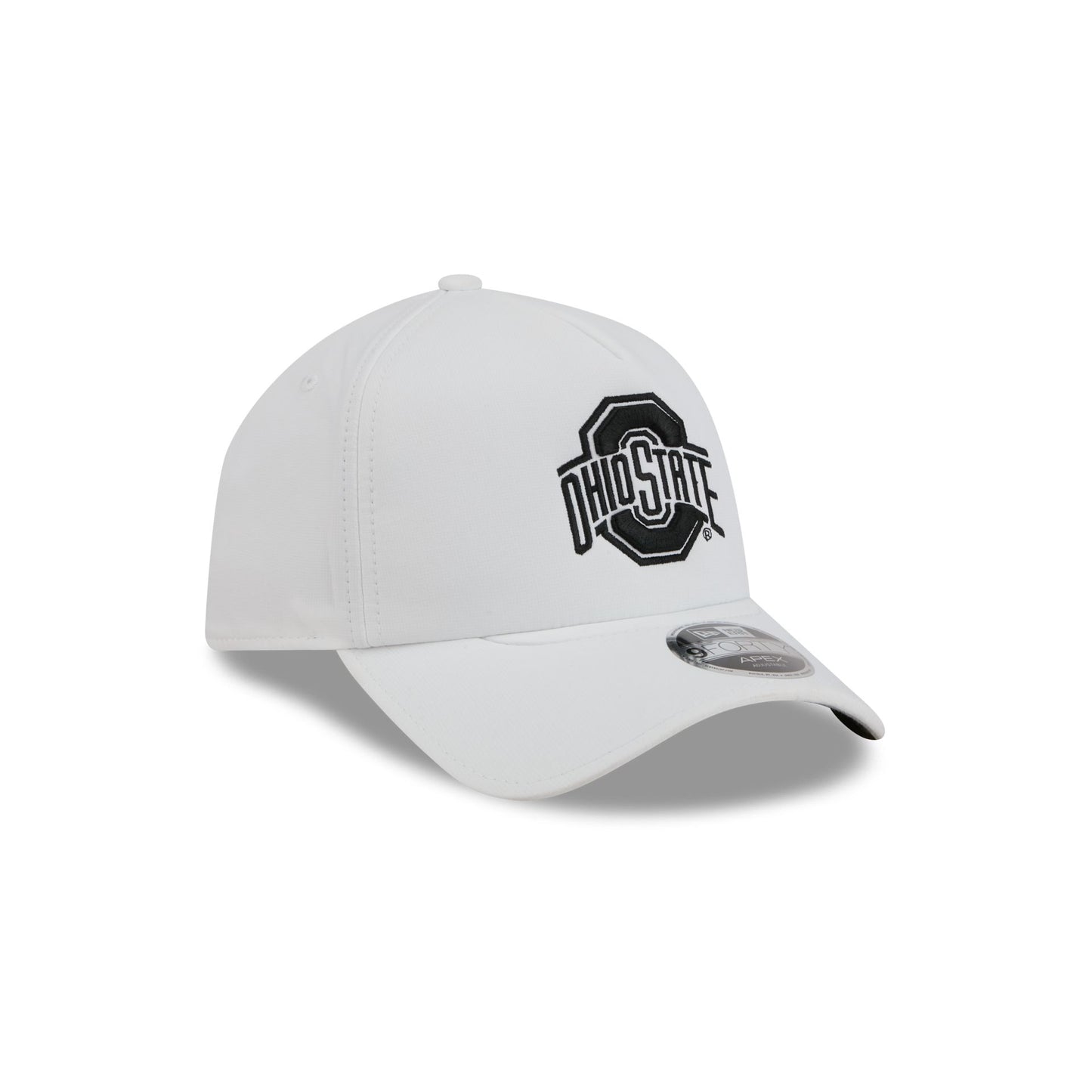 The Ohio State Buckeyes White 9FORTY APEX Snapback features a black and white embroidered Buckeyes logo at the front panel with an adjustable snapback closure at the rear and a gray undervisor.