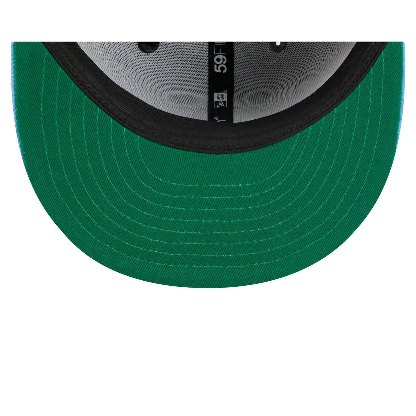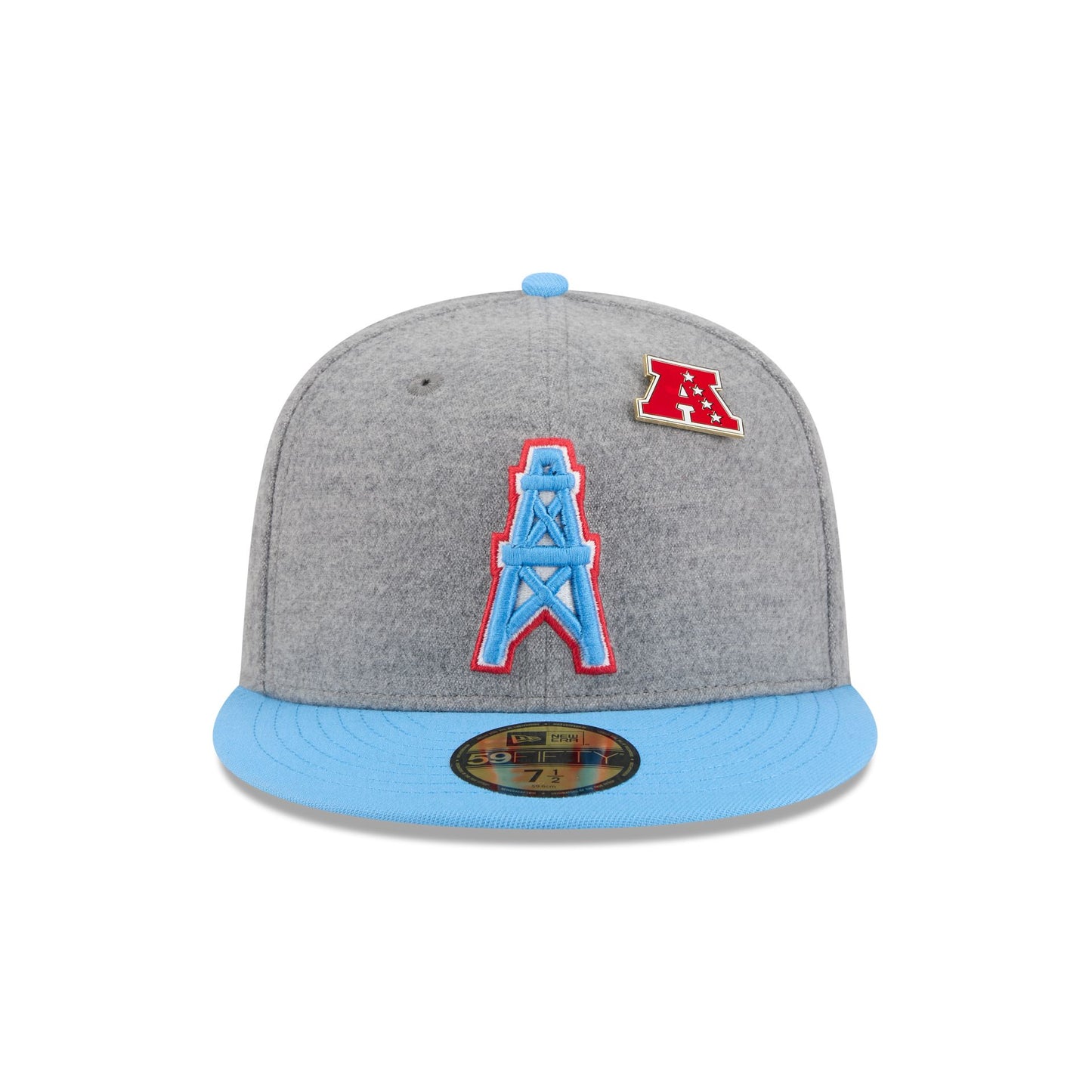 The Oilers Heather Gray Wool 59FIFTY Fitted Cap features an embroidered Oilers Historic logo and conference pin at the front panels against a wool fabrication throughout. Additional details include a helmet graphic at the right-wear side, an NFL Shield logo at the rear, and a green undervisor.