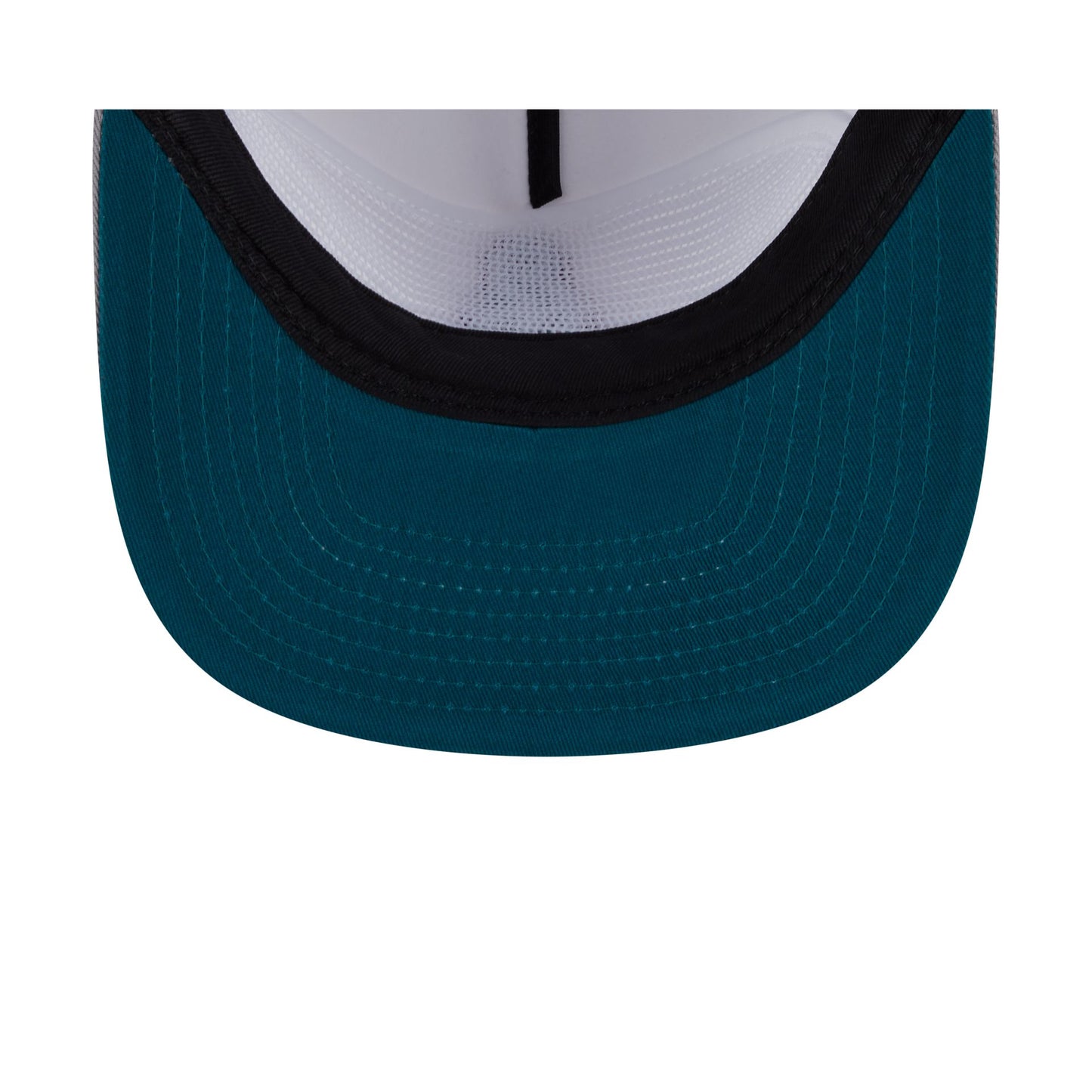 The Oilers Optic White Golfer features an embroidered Oilers Historic logo at the front panels with a matching team wordmark at the right-wear side. Additional details include a snapback closure at the rear and a teal undervisor.