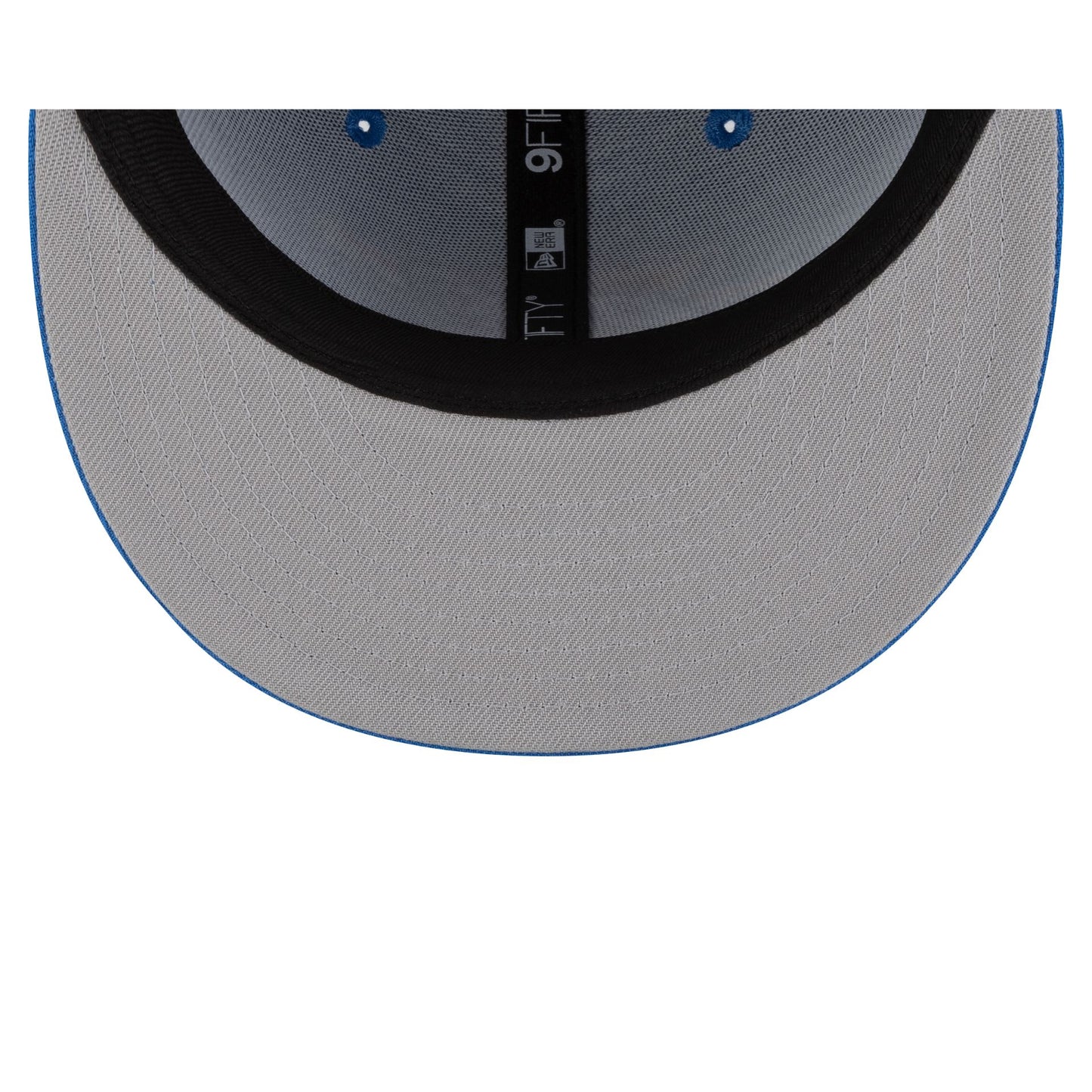 The Oklahoma City Thunder Christmas Day Game 9FIFTY Snapback features an embroidered Thunder logo at the front panels with an NBA Logoman snowflake patch at the right-wear side. Additional details include an adjustable white snapback closure at the rear and a gray undervisor.