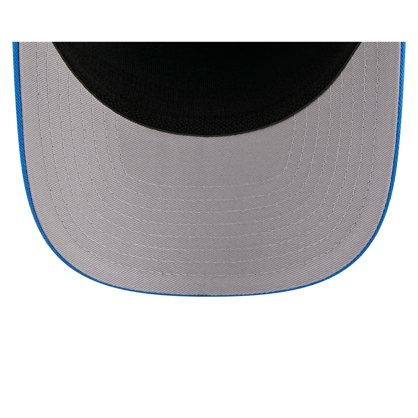 The Oklahoma City Thunder Split Panel 9SEVENTY Stretch-Snap features an embroidered Thunder logo at the front panel with a split crown construction and a rope at the visor. Additional details include an adjustable stretch-snap closure at the rear and a gray undervisor.