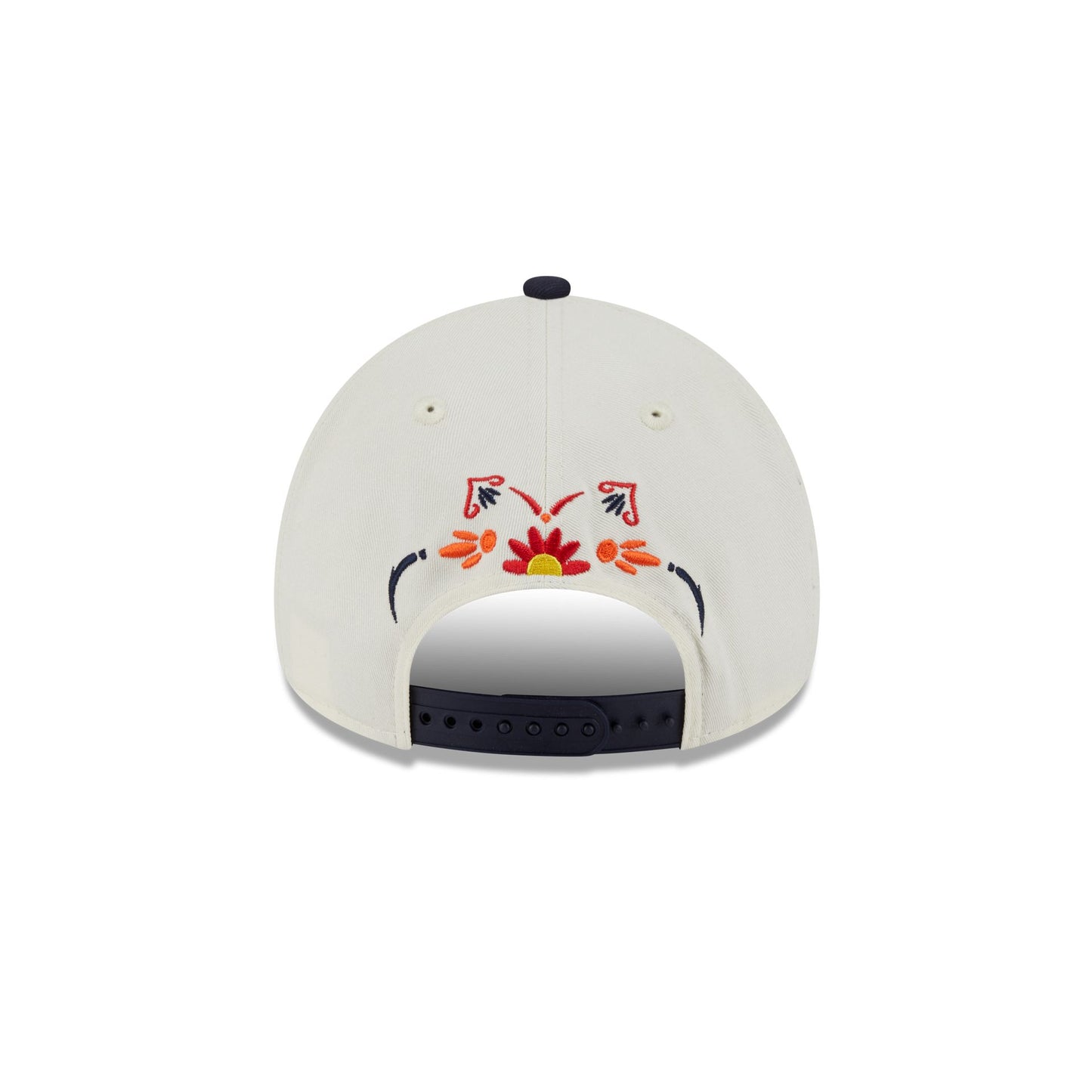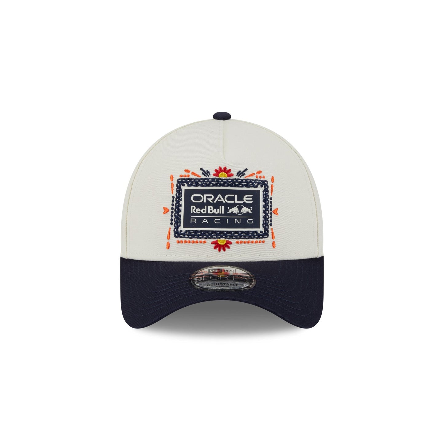 The Oracle Red Bull Racing 2025 Mexico City Race Special 9FORTY A-Frame Snapback features a silicone Oracle Red Bull Racing tag at the front panels with floral embroidery at the front and above an adjustable snapback closure at the rear.