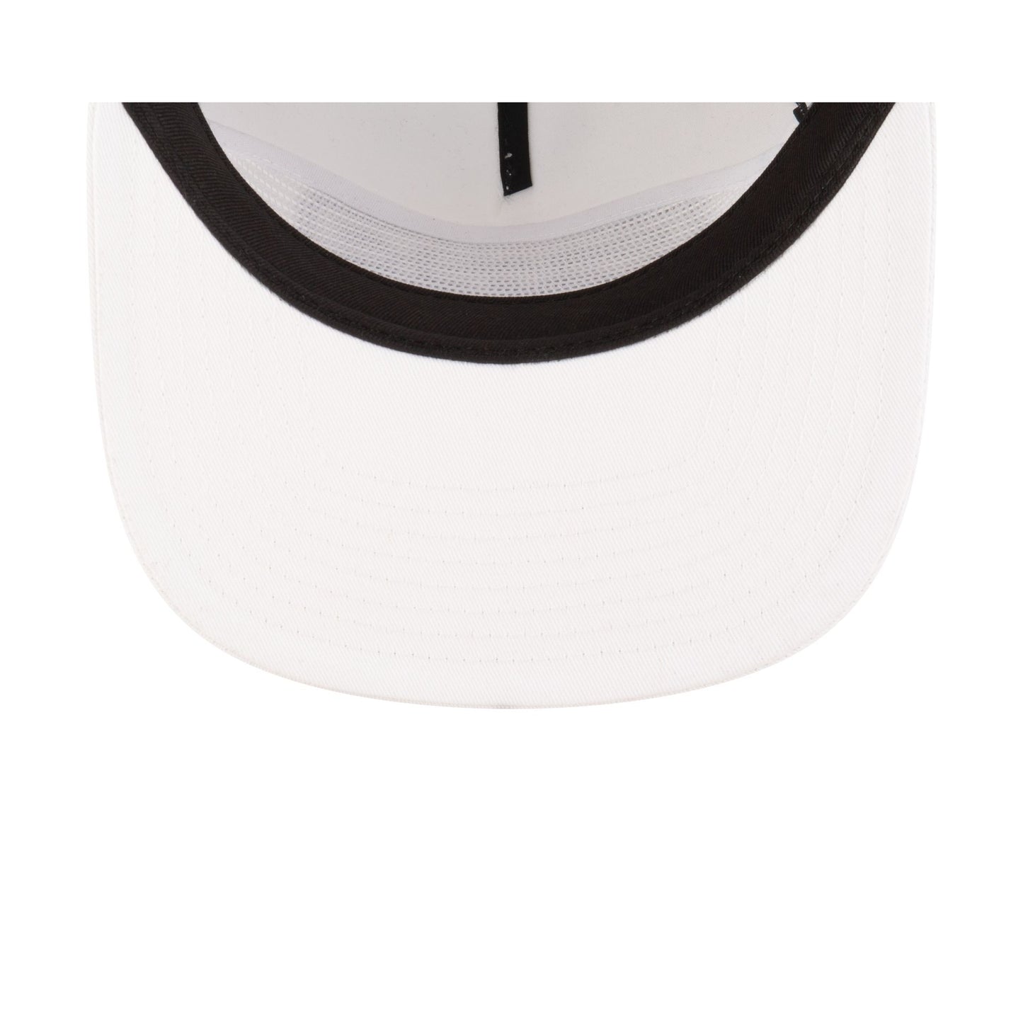 The Oracle Red Bull Racing Chrome White Golfer features an embroidered Oracle Red Bull Racing patch at the front panel with a matching team wordmark above a snapback closure at the rear and a Welcome to Las Vegas patch at the right-wear side.