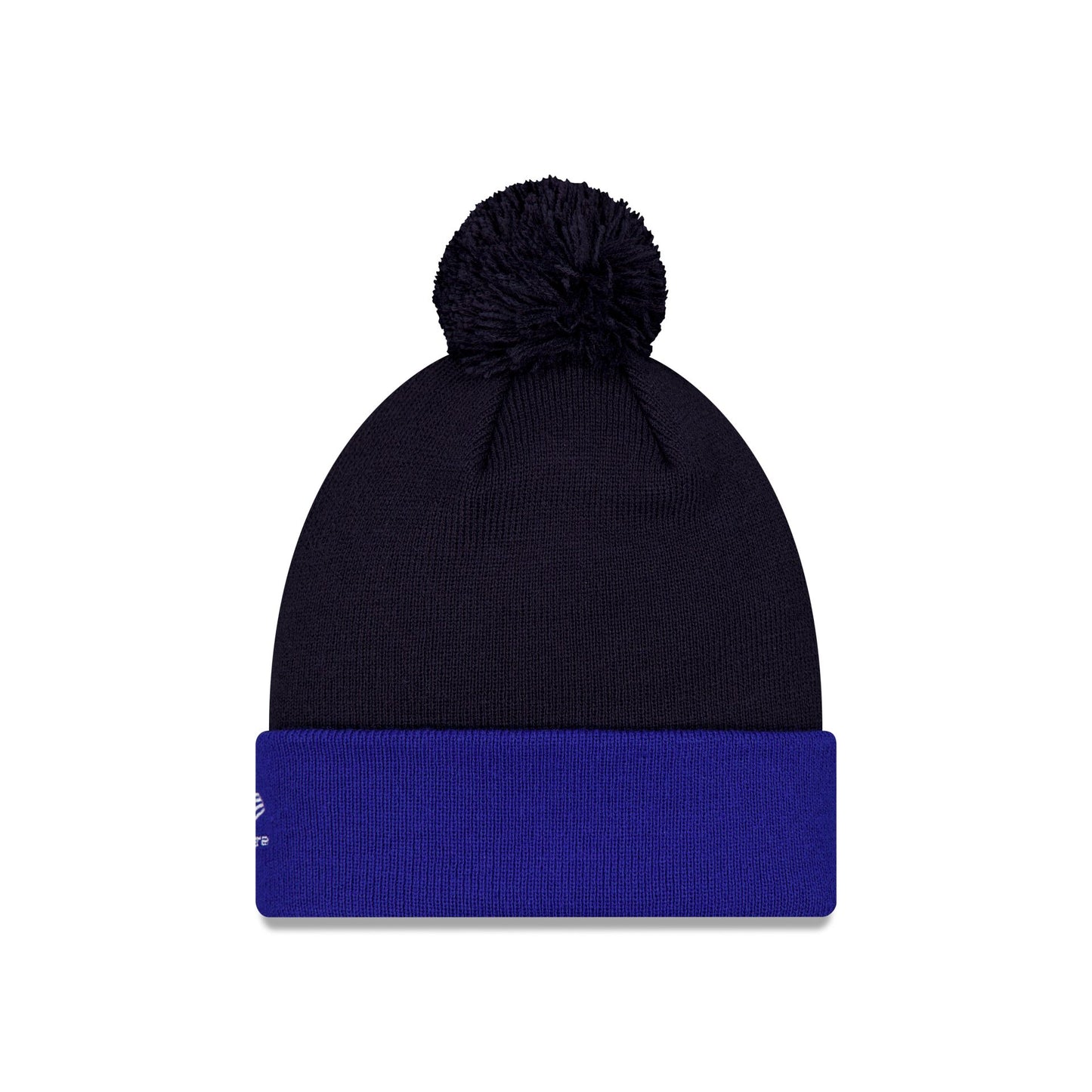 The Oracle Red Bull Racing Essential Pom Knit features a woven Oracle Red Bull Racing tag at the front with an embroidered New Era Flag at the left-wear side and a one-time removable pom.