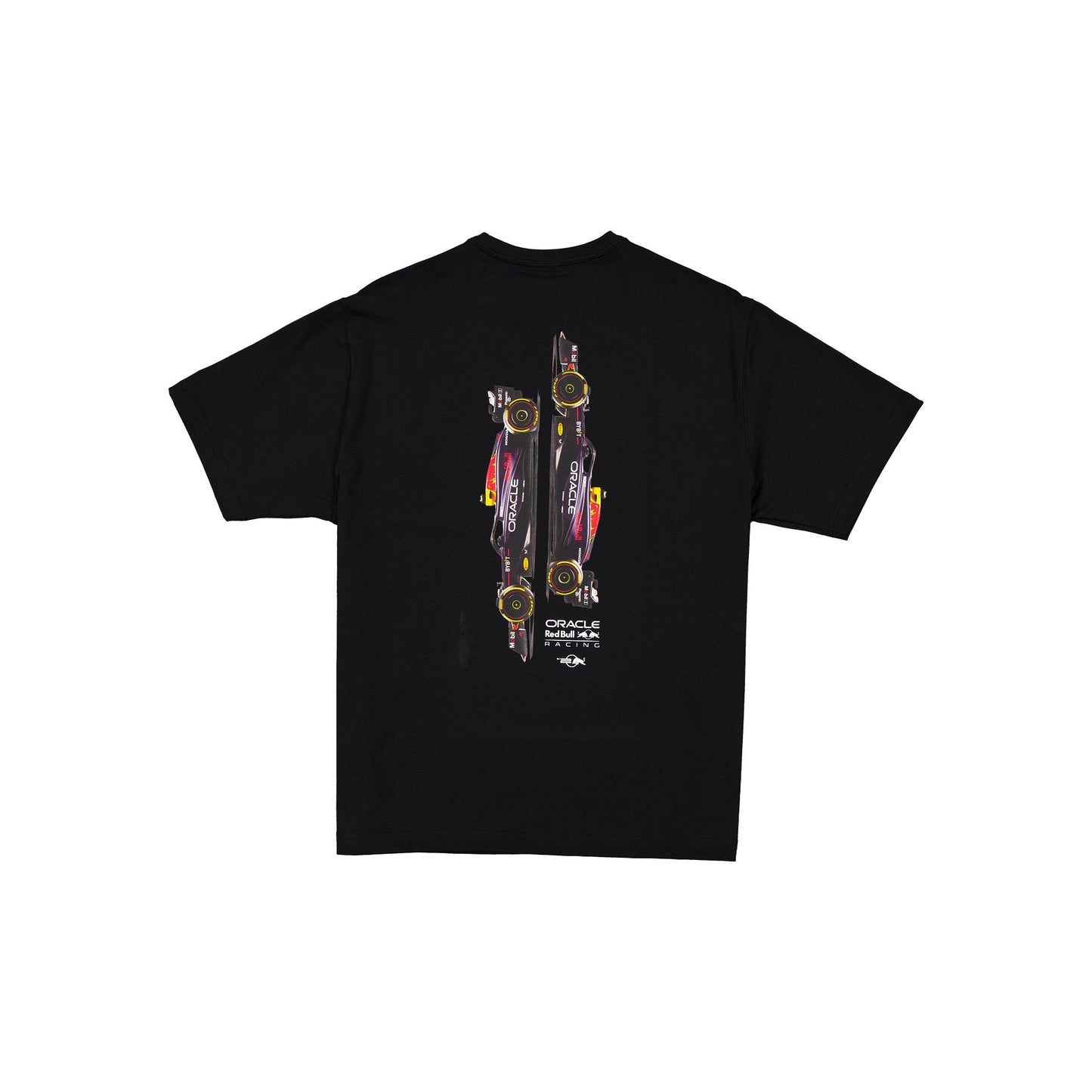The Oracle Red Bull Racing RB20 Black T-Shirt features a screen-printed Red Bull logo at the front with a race car graphic at the rear.