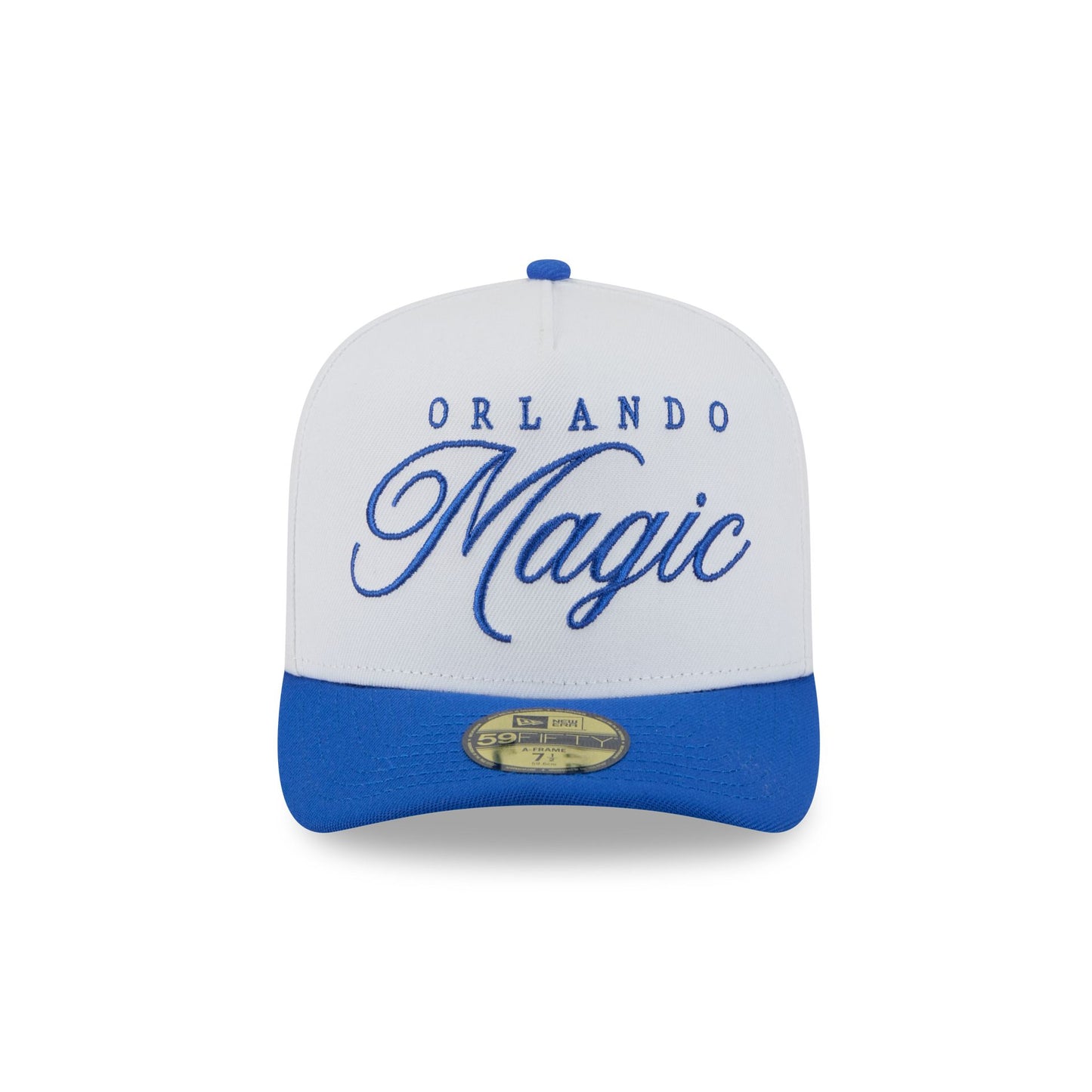 The Orlando Magic 2025 Draft 59FIFTY A-Frame Fitted Cap features an embroidered Magic script wordmark at the front panels with a team logo at the right-wear side. Additional details include a NBA Logoman at the rear and a gray undervisor.