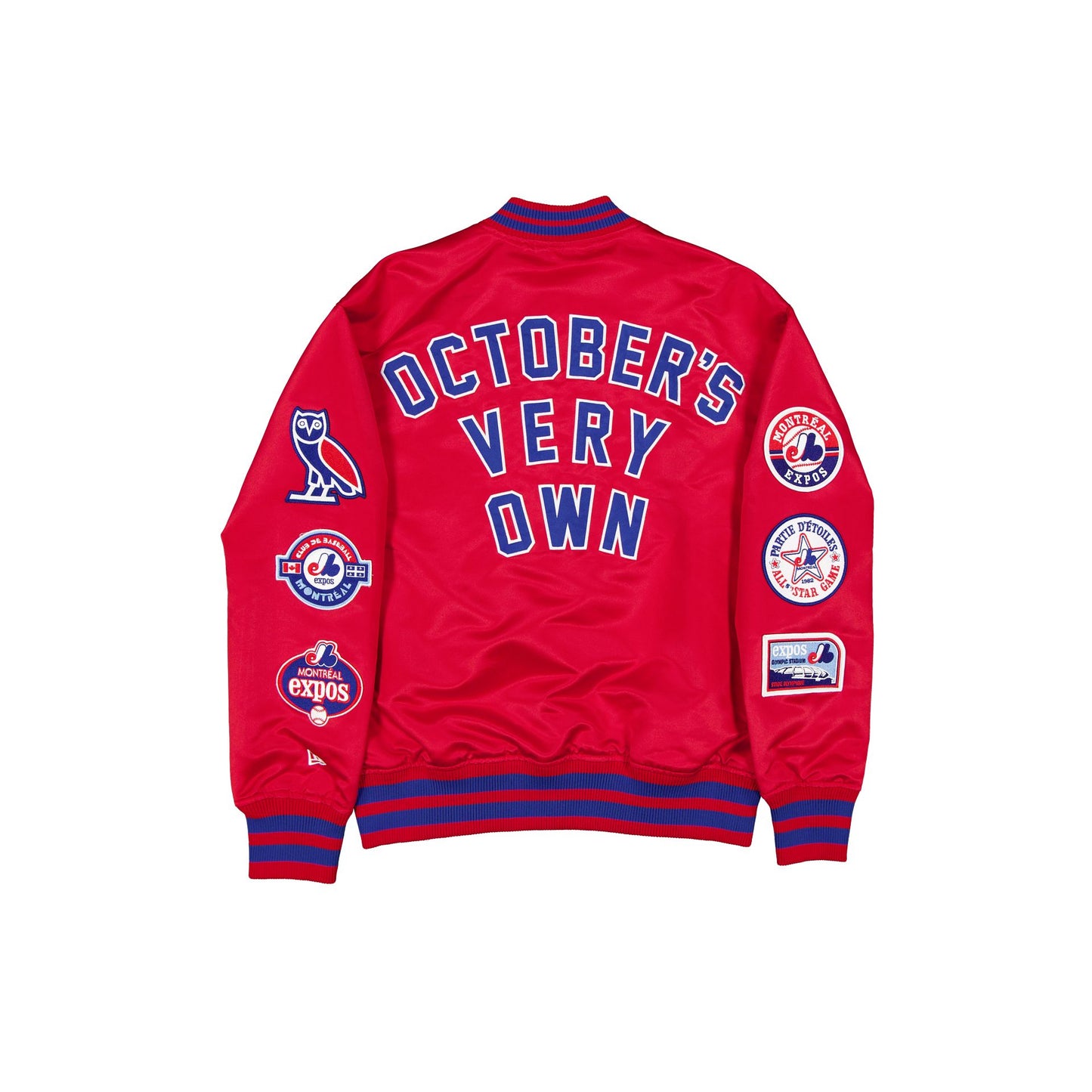 The OVO x Montreal Expos Jacket features an embroidered satin applique Expos wordmark and logo with a snap button closure at the front and an October's Very Own wordmark at the rear. Additional details include alternate team logo patches and a matching OVO logo patch at the sleeves with striped cuffs.