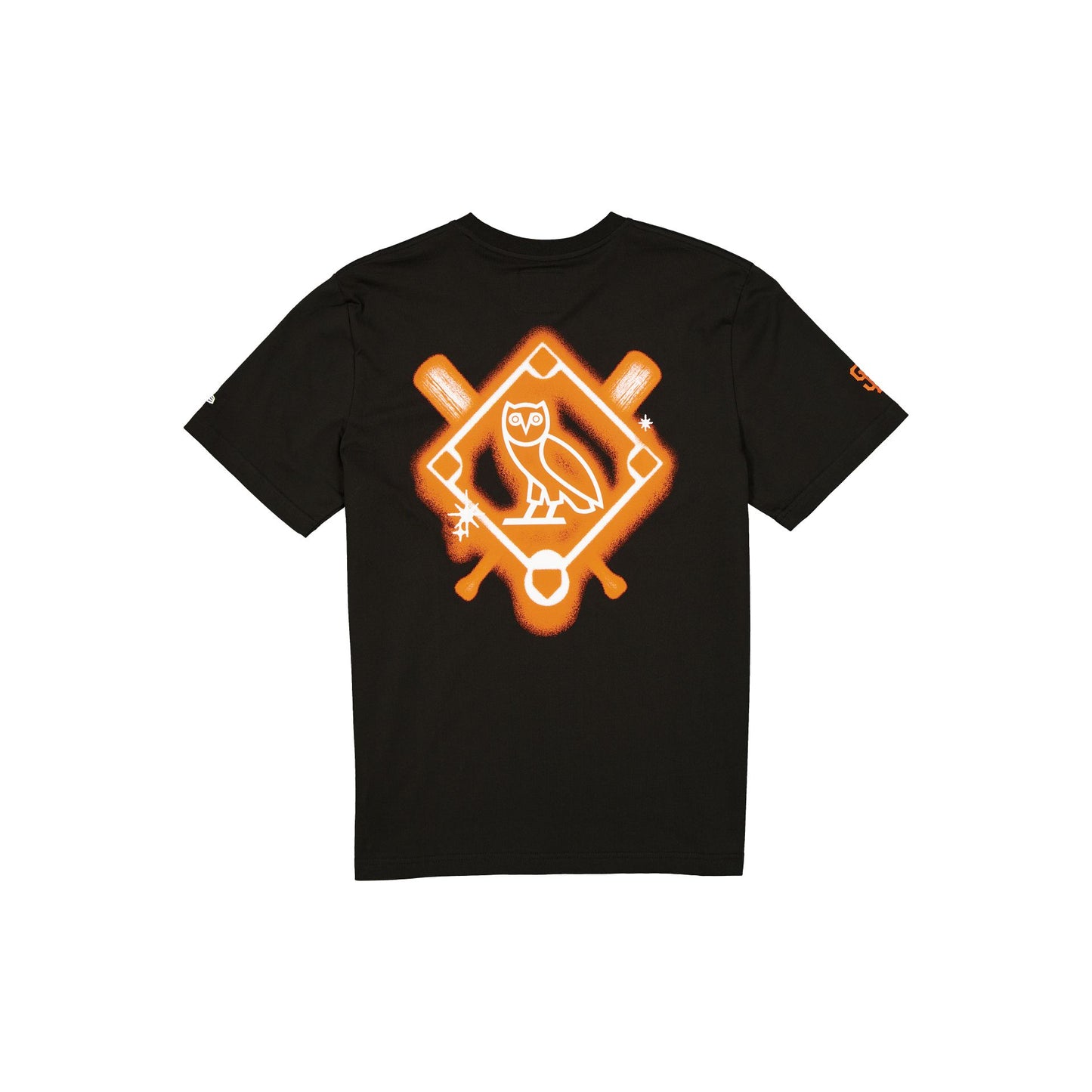 The OVO x San Francisco Giants T-Shirt features a spray paint effect Giants wordmark and logo screen-printed at the chest with a matching OVO baseball diamond graphic at the rear and an alternate team logo at the right sleeve.