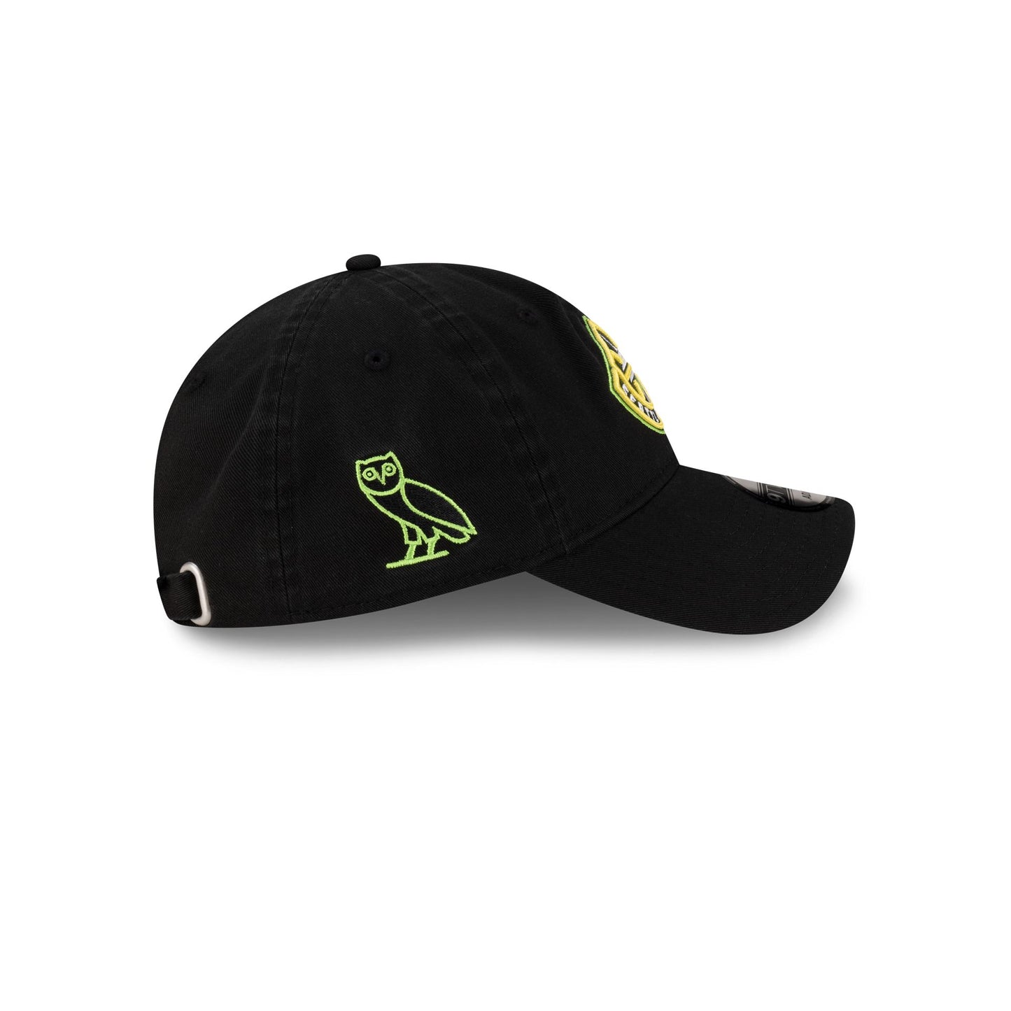 The OVO x Seattle Storm 9TWENTY Adjustable Cap features an embroidered Storm logo at the front panels with a matching October's Very Own wordmark above an adjustable metal clasp closure at the rear. Additional details include an OVO logo at the right-wear side and a gray undervisor.