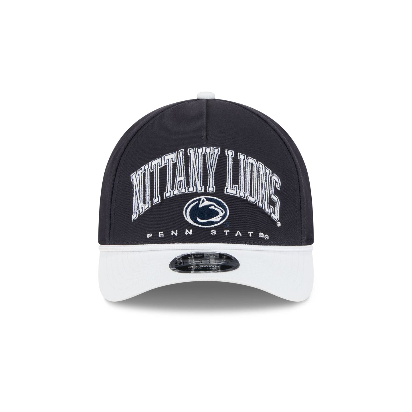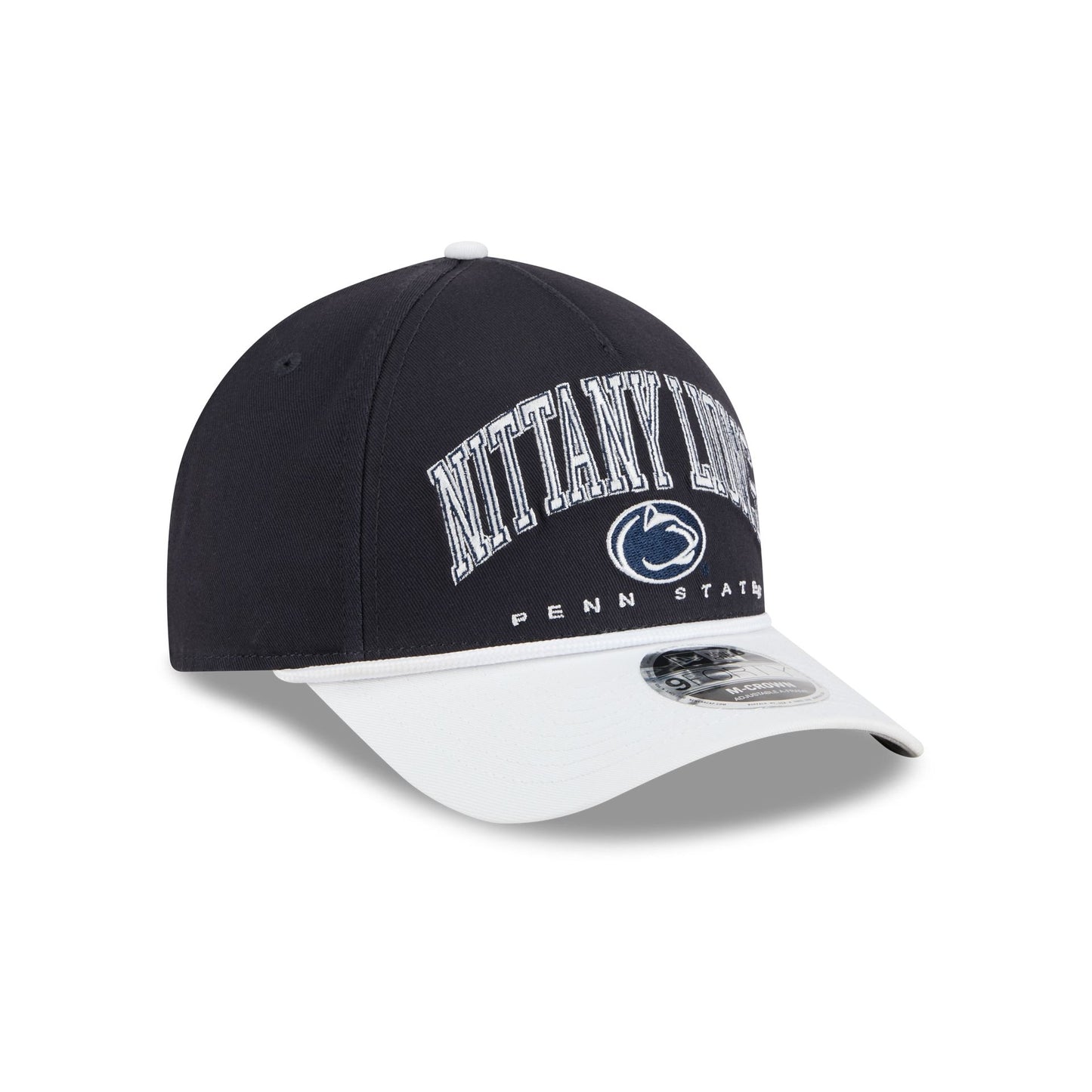The Penn State Nittany Lions Arch 9FORTY M-Crown A-Frame Snapback features an embroidered Nittany Lions Alternate graphic at the front panels with a rope at the visor. Additional details include an adjustable snapback closure at the rear with a gray undervisor.