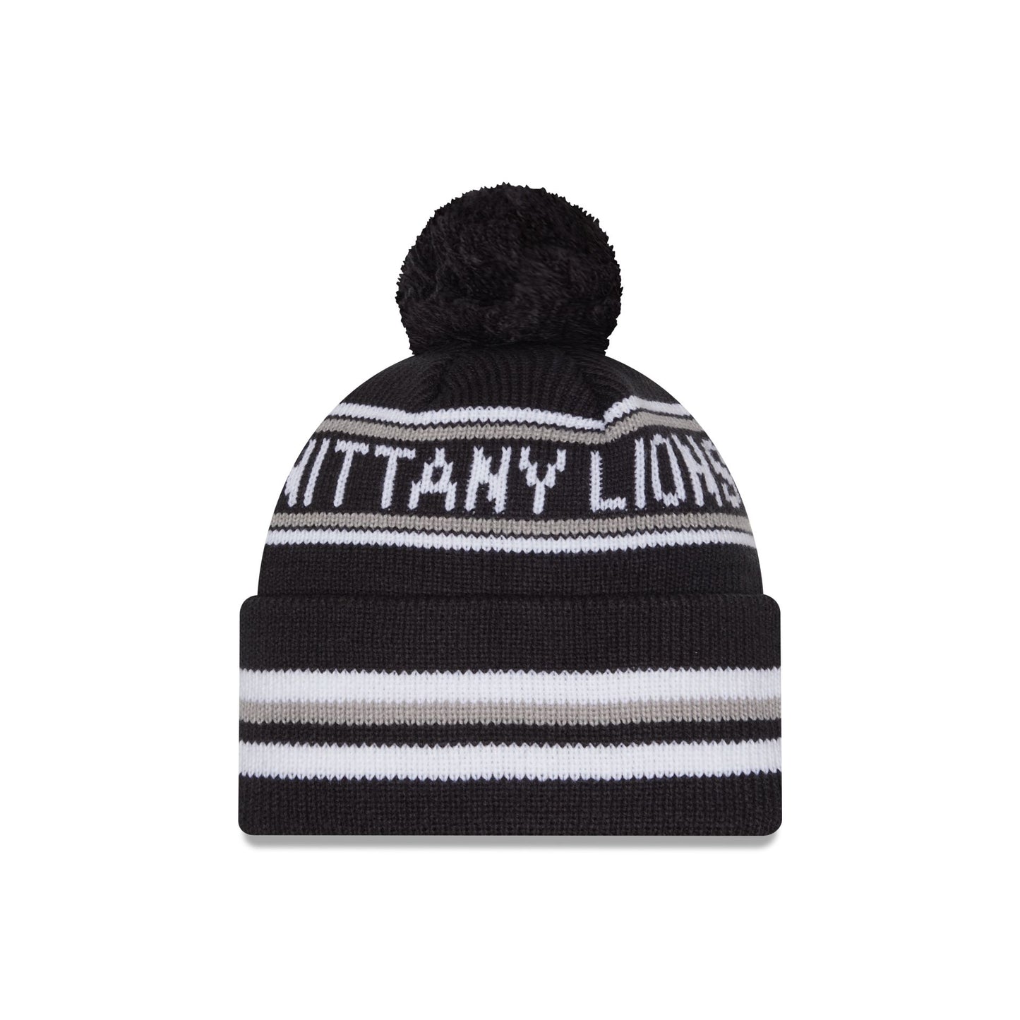 The Penn State Nittany Lions Classic Pom Knit Hat features an embroidered Nittany Lions logo at the front cuff with a wordmark at the crown and a one-time removable pom.