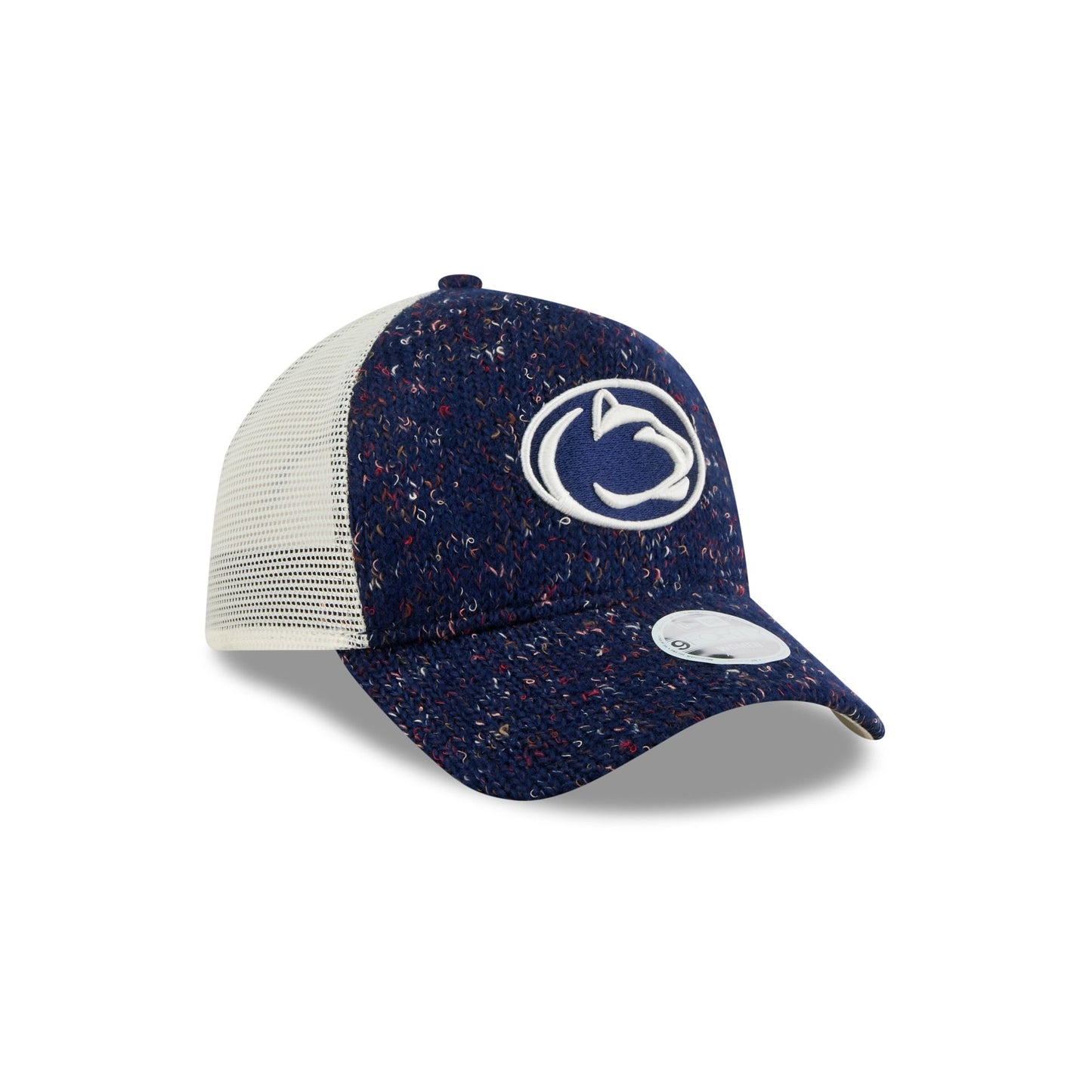 The Penn State Nittany Lions Knit Women's 9FORTY A-Frame Trucker features an embroidered Nittany Lions logo at the front knit panels. Additional details include a snapback closure at a mesh rear and white undervisor.