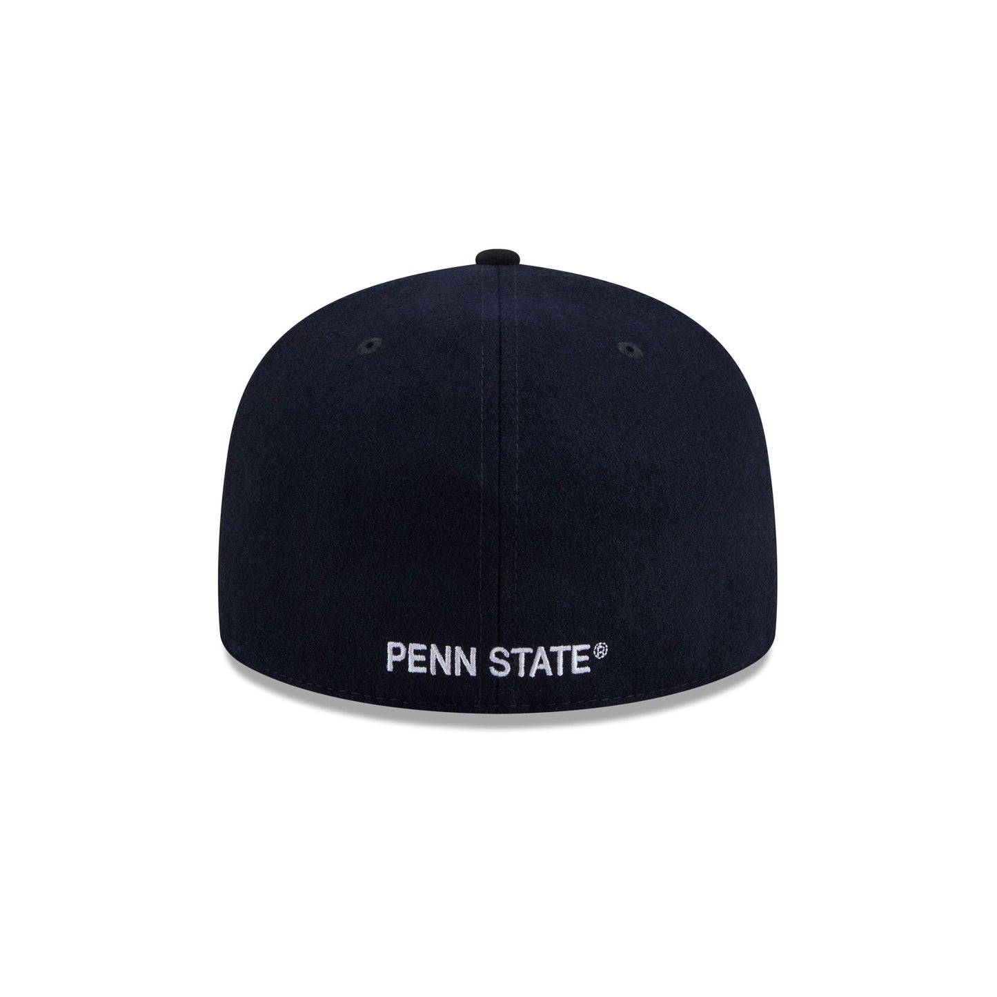 The Penn State Nittany Lions Melton Wool 59FIFTY Fitted Cap features a chenille applique Nittany Lions logo patch at the front panels with an embroidered team wordmark at the rear and a gray undervisor.