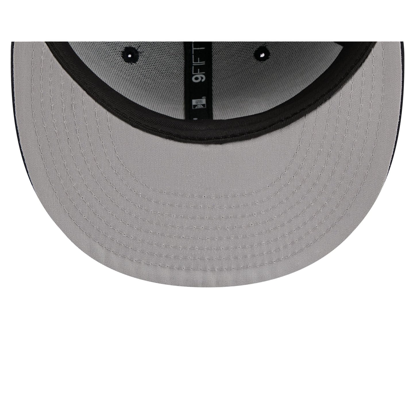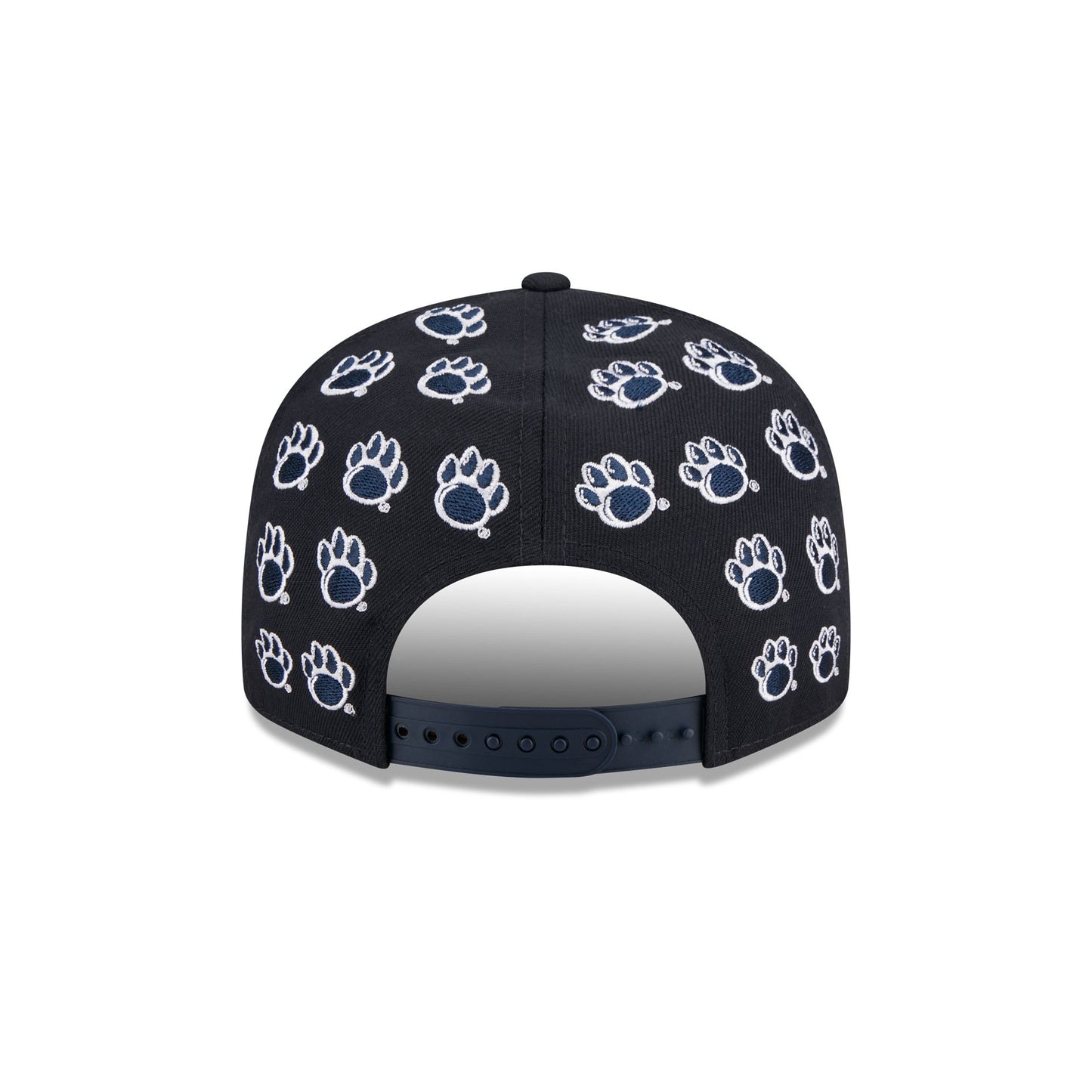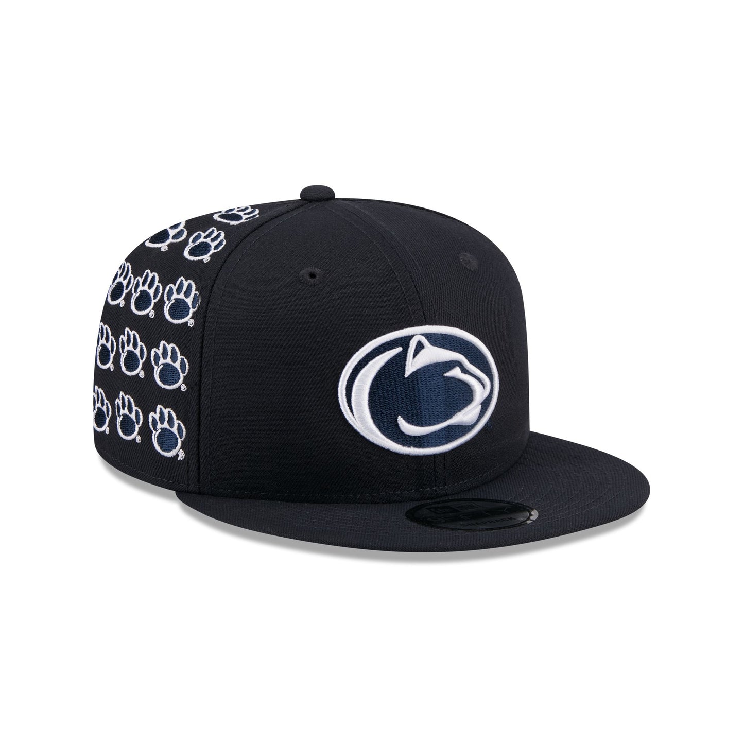 The Penn State Nittany Lions Sticker Helmet 9FIFTY Snapback features an embroidered Nittany Lions logo at the front panels with embroidered team stickers the back panels. Additional details include an adjustable snapback closure at the rear and a gray undervisor.
