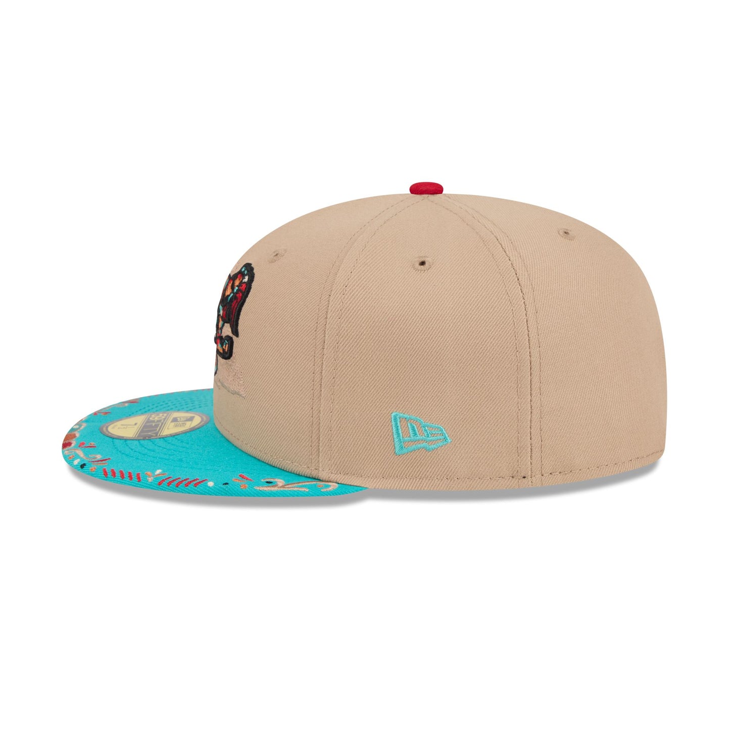 The Pensacola Blue Wahoos 2026 Copa de la Diversión 59FIFTY Fitted Cap features an embroidered Blue Wahoos logo at the front panels with a matching MiLB Batterman logo at the rear, a decorative embroidery at the visor, and a gray undervisor.