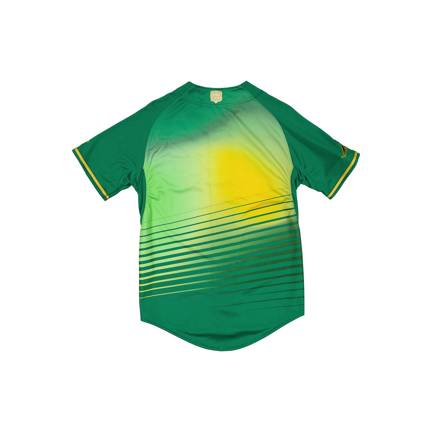The Pericos de Puebla LMB 100th Anniversary Away Jersey features an embroidered Pericos home name at the chest with a New Era Official Merchandise patch at the front hemline, a team logo at the right sleeve, and a LMB 100th Anniversary logo at the rear.