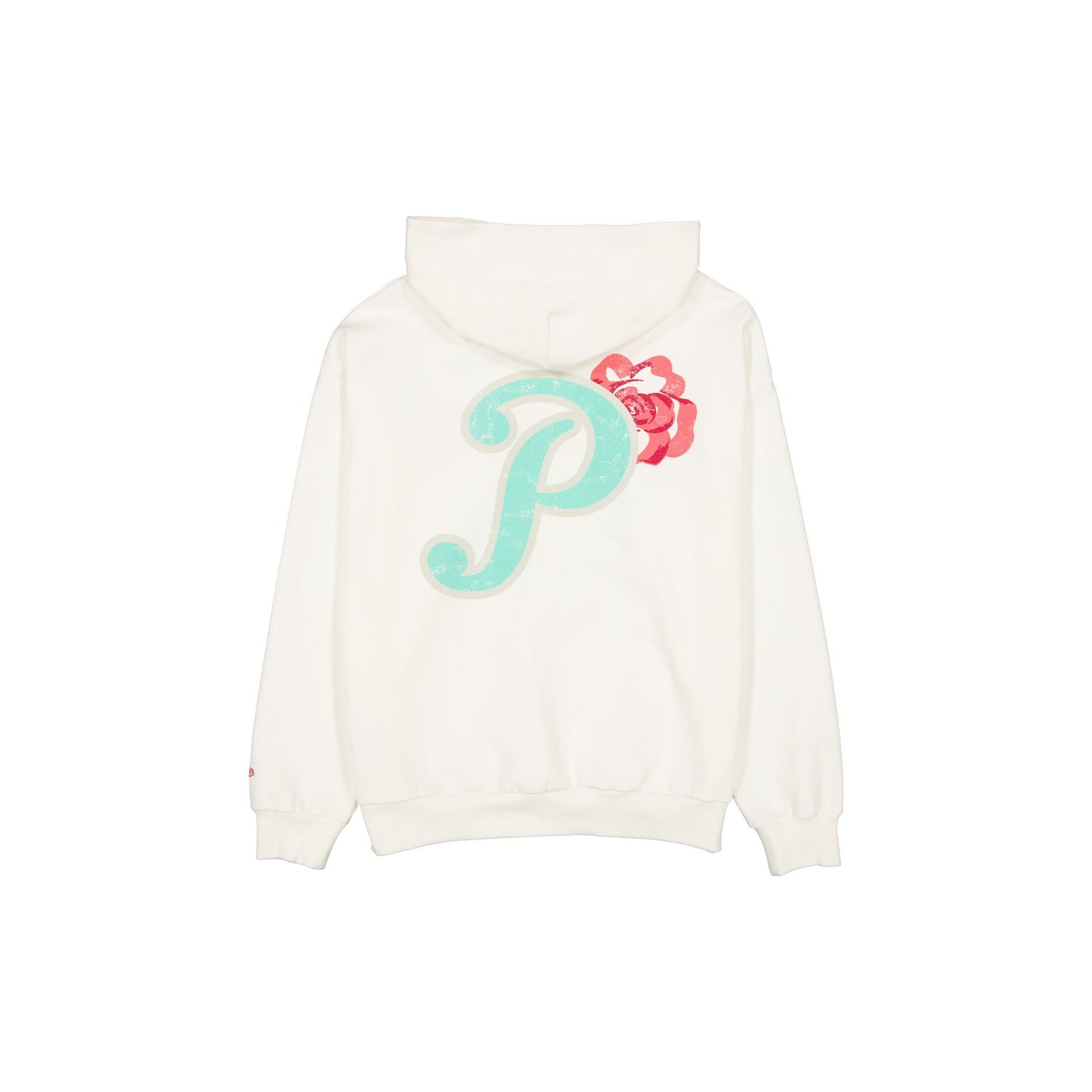The Pericos de Puebla Stone Floral Hoodie features an embroidered Pericos floral wordmark at the front with a screen-printed floral logo at the rear. Additional details include kangaroo pockets and adjustable drawstring at the hood.