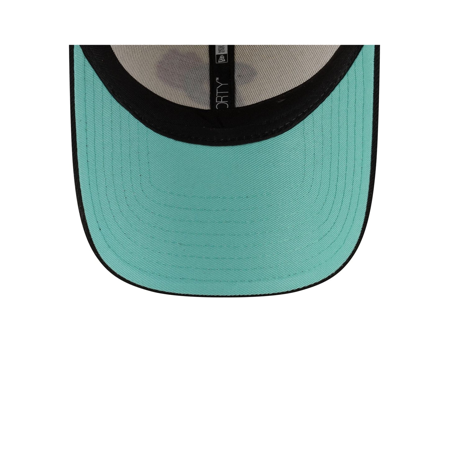 The Pericos de Puebla Two-Tone Rose 9FORTY Snapback features an embroidered Pericos logo and roses at the front panels with a matching team wordmark at the right-wear side. Additional details include an alternate team wordmark above a snapback closure at the rear with a black visor and a mint undervisor.