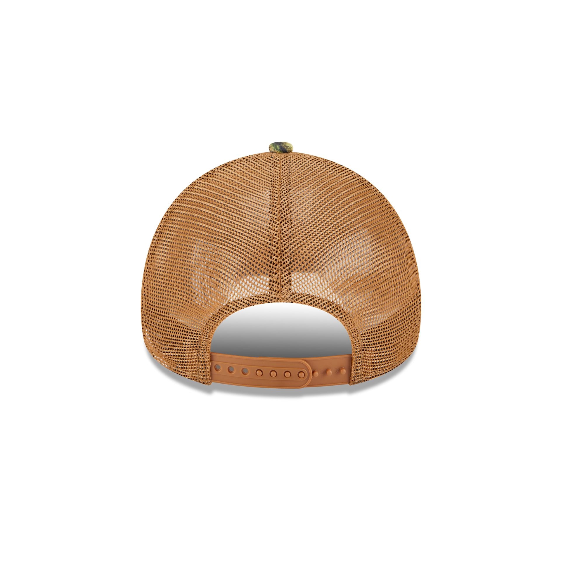 The Philadelphia 76ers 2025 All-Star Game Fan Pack Grove 9FORTY A-Frame Trucker features an embroidered 76ers wordmark at the front camo panels with a mesh back. Additional details include a team logo on the right-wear side, a snapback closure at the rear, and a gray undervisor.