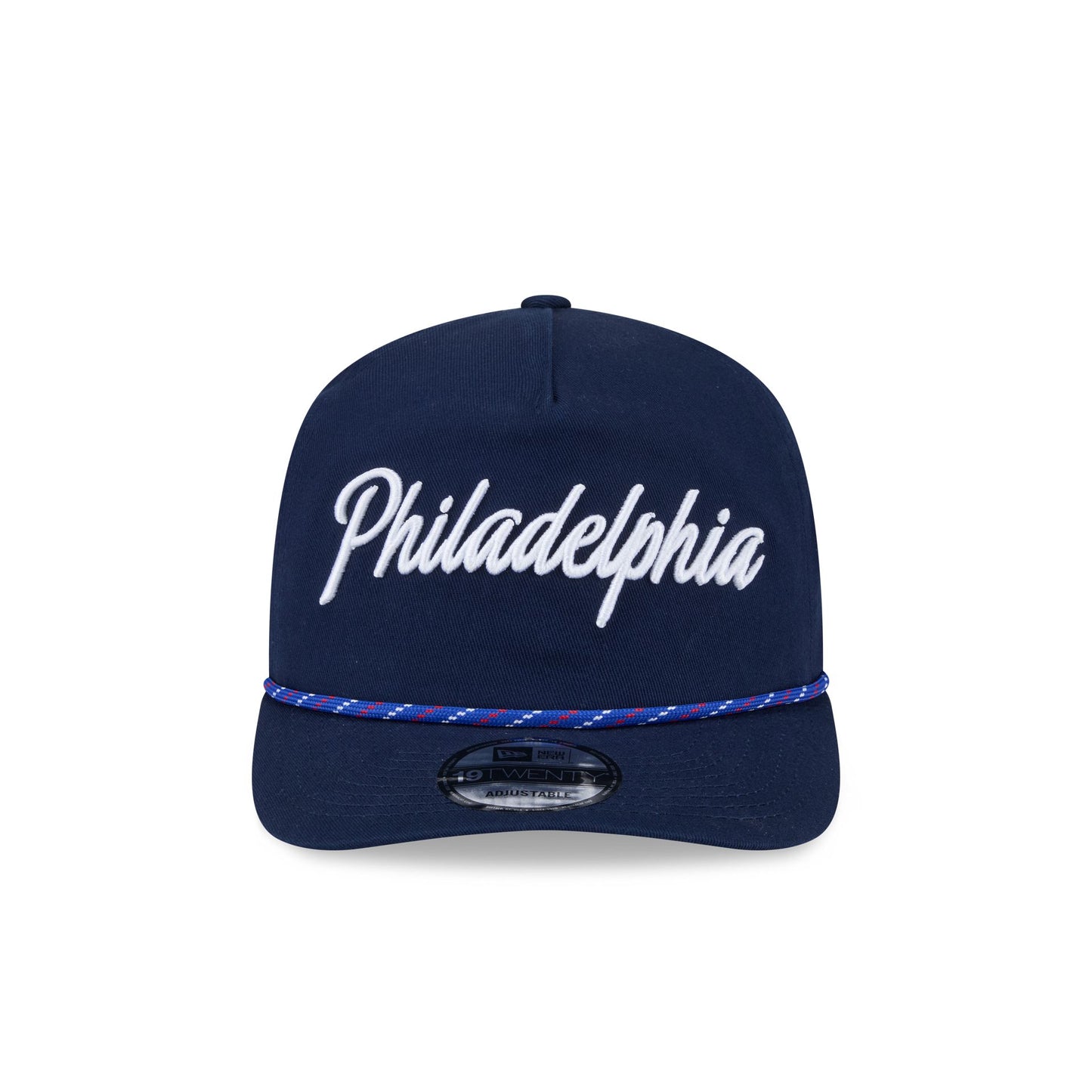 The Philadelphia 76ers 2025 City Edition 19TWENTY Adjustable Cap features an embroidered 76ers City Edition logo at the front panels with a logo at the right-wear side and a rope at the visor. Additional details include the NBA Logoman above an adjustable snapback closure at the rear and a gray undervisor.
