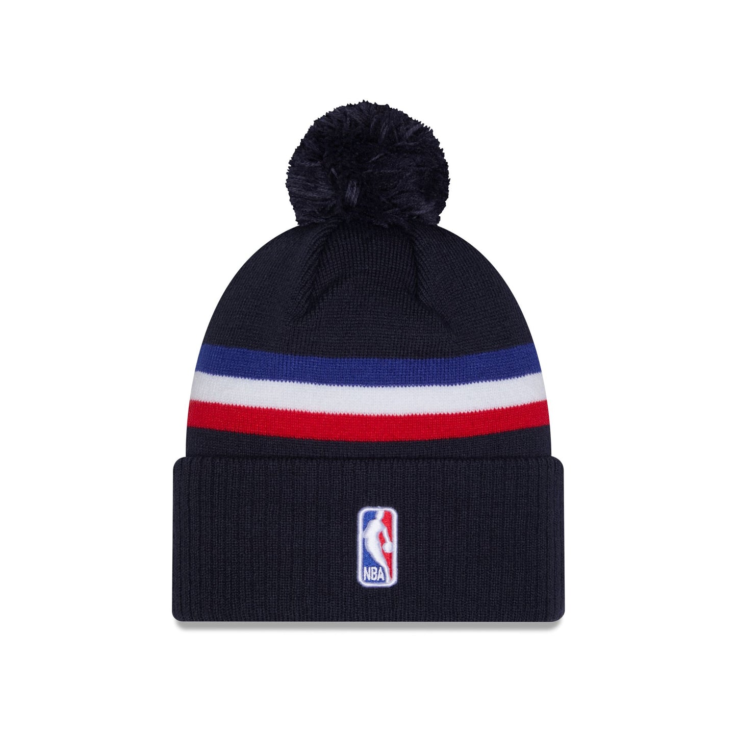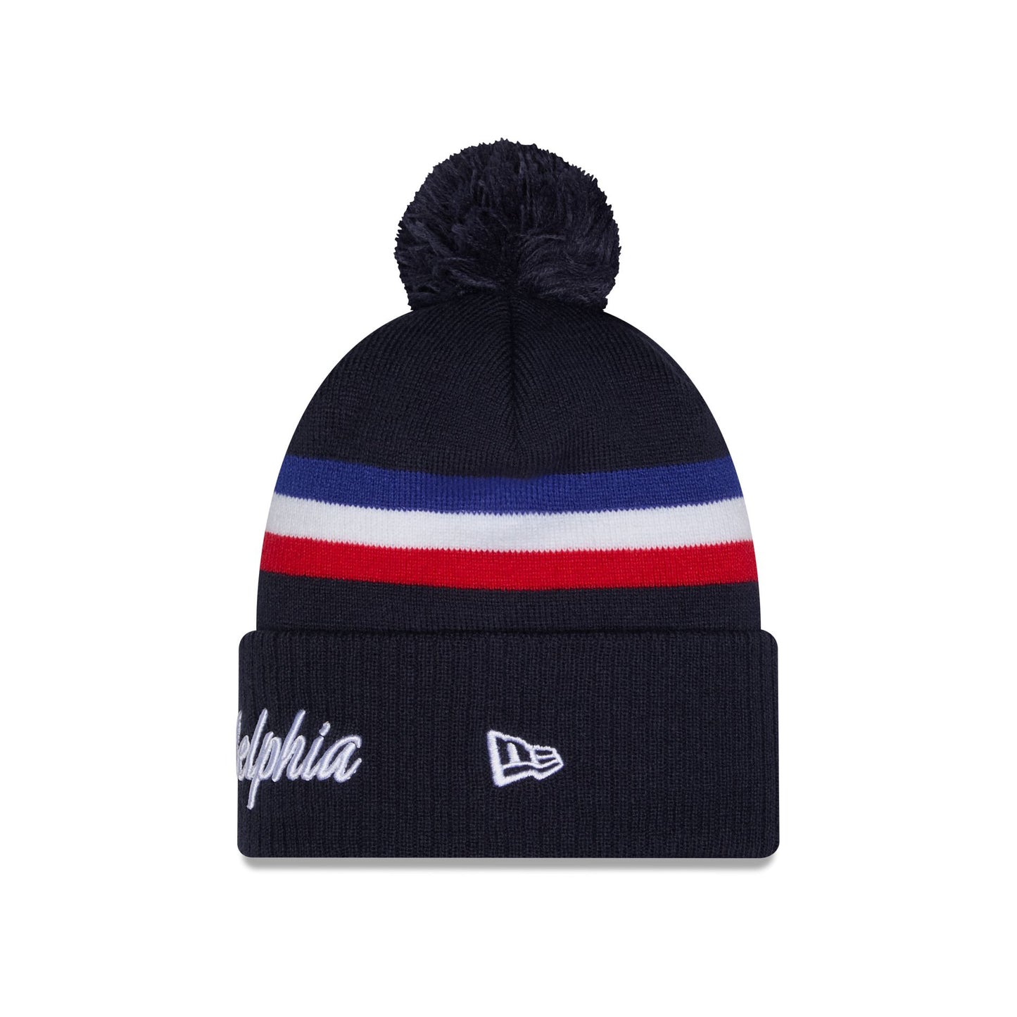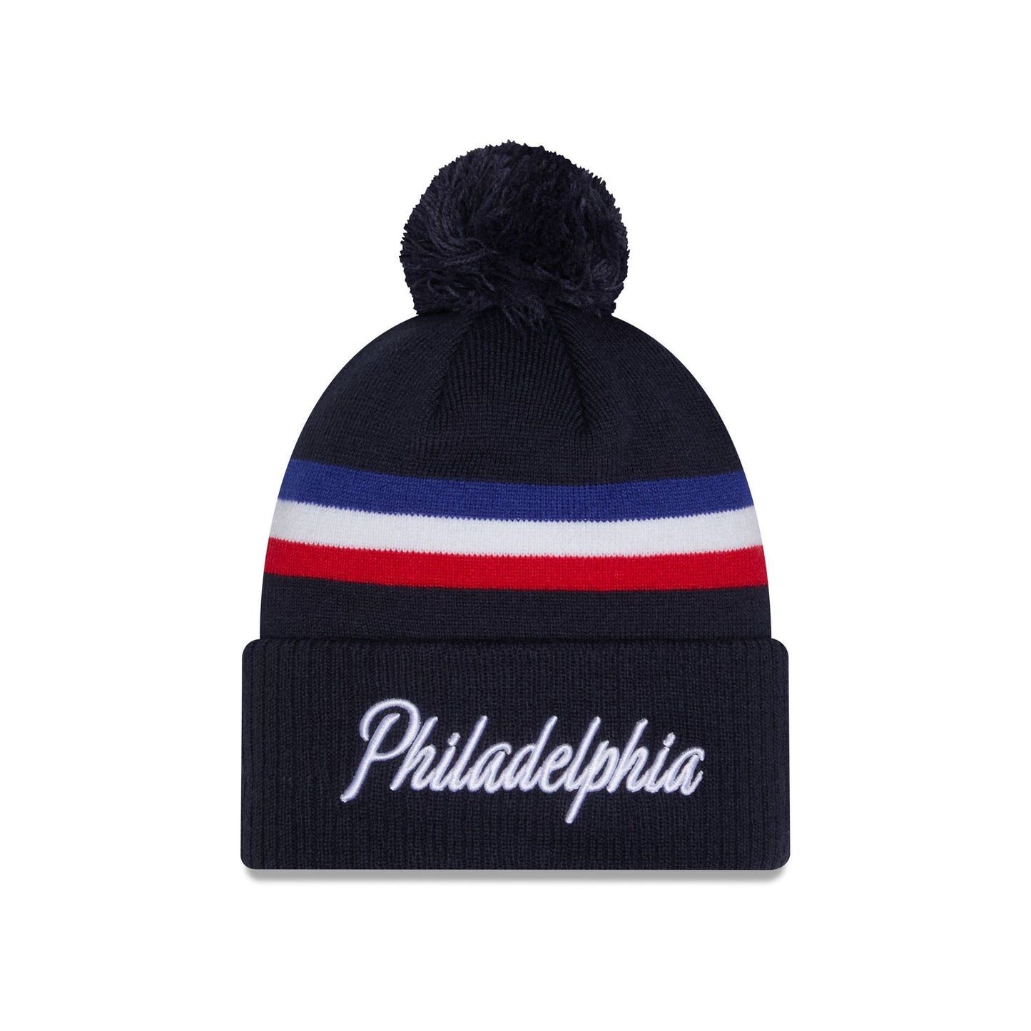 The Philadelphia 76ers 2025 City Edition Pom Knit features an embroidered 76ers City Edition logo at the front cuff with the NBA Logoman at the rear and a one-time removable pom.