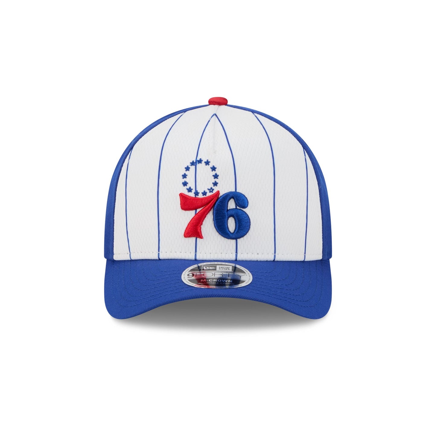 The Philadelphia 76ers 2025 Tip-Off 9FORTY M-Crown A-Frame Snapback features an embroidered 76ers logo at the front panels against a pinstripe jersey fabrication with the NBA Logoman at the right-wear side. Additional details include an adjustable snapback closure at the rear and a gray undervisor.