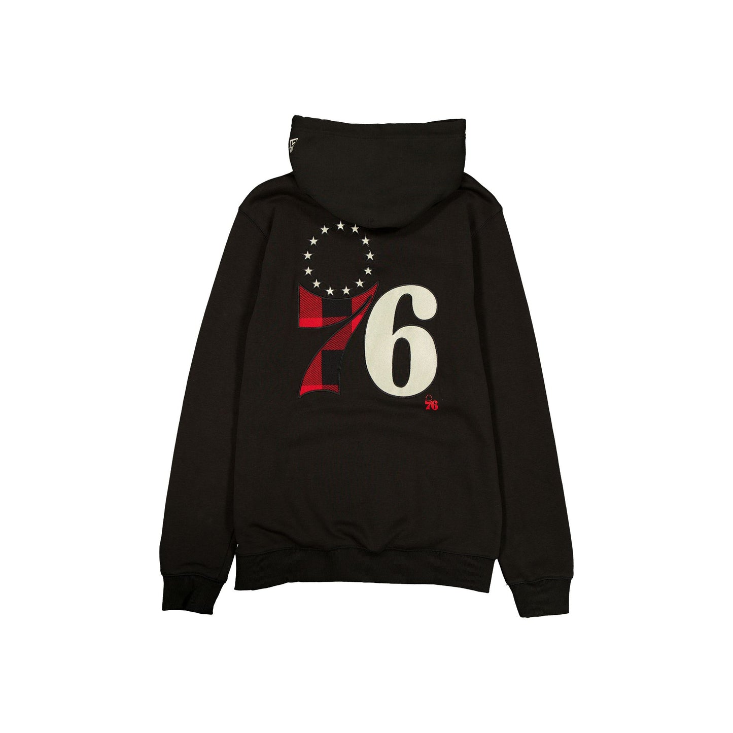 The Philadelphia 76ers Evergreen Check Hoodie features an embroidered applique 76ers checkered wordmark at the front with a matching interior hood and logo at the rear. Additional details include kangaroo pockets and adjustable drawstrings at the hood.