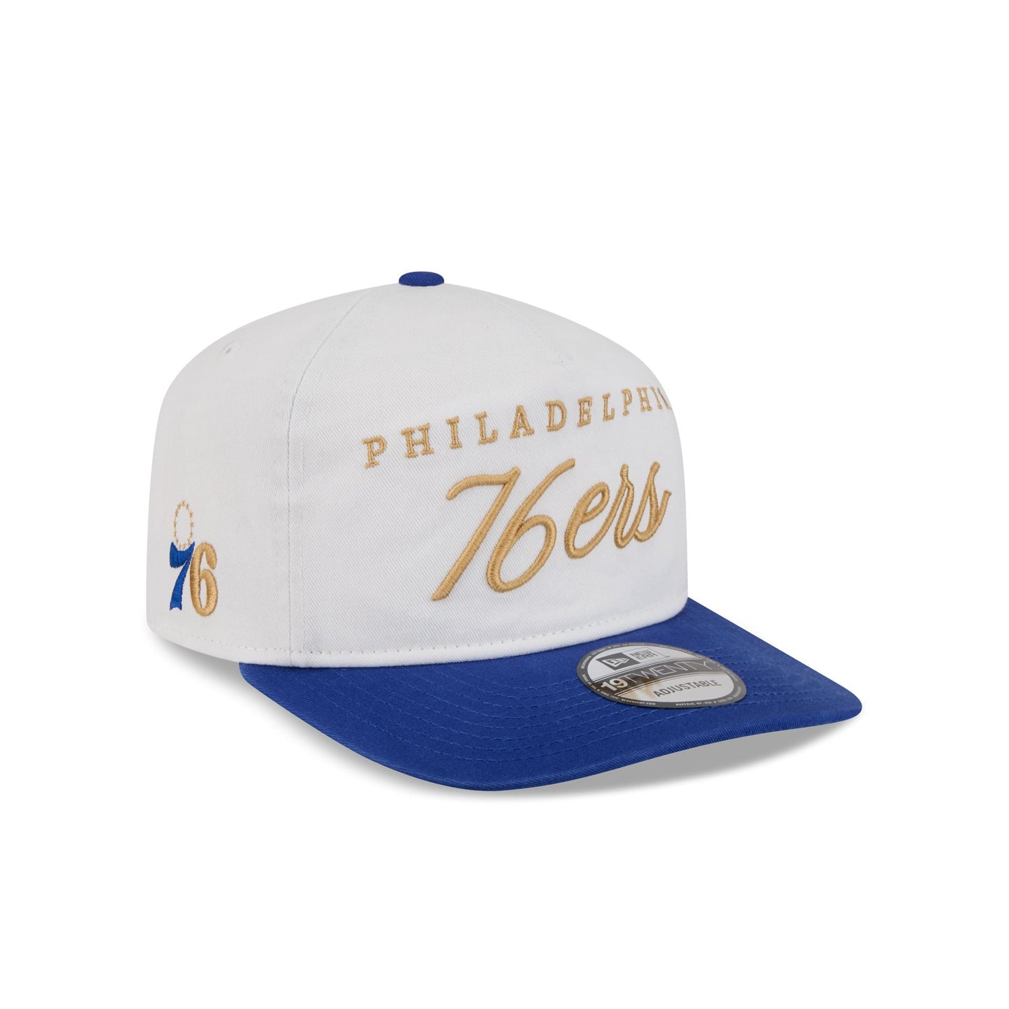 The Philadelphia 76ers Gold Scripted 19TWENTY Adjustable Cap features an embroidered 76ers gold script wordmark at the front panels with a matching team logo at the right-wear side. Additional details include an adjustable snapback closure at the rear and a gray undervisor.