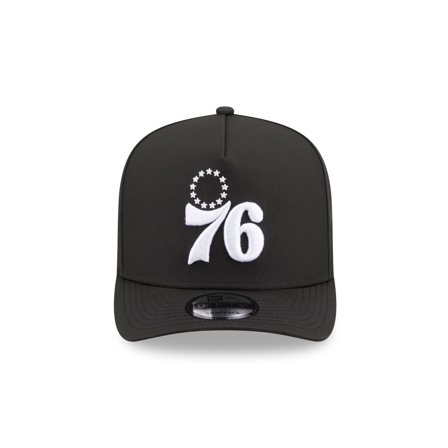 The Philadelphia 76ers GORE-TEX Black 9FIFTY A-Frame Snapback features an embroidered white 76ers logo at the front panels with a metallic sheen silicone New Era Flag logo and GORE-TEX logo at the left-wear side. Additional details include an adjustable snapback closure at the rear, a gray undervisor, and a polyester fabrication throughout the cap. It is waterproof, breathable, and lightweight.