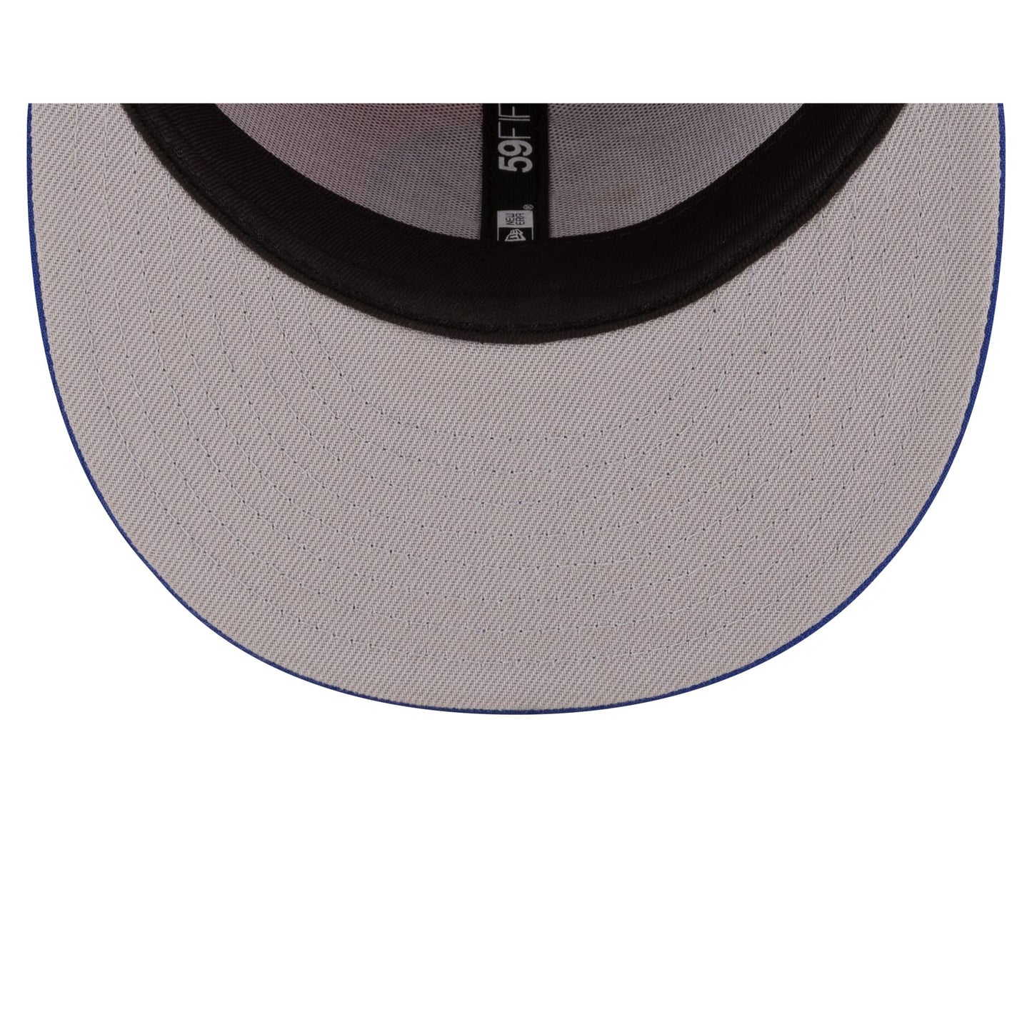 The Philadelphia 76ers Hardwood Classics 80s Pinwheel 59FIFTY Fitted Cap features an embroidered 80s 76ers logo at the front panels with an NBA Logoman at the rear, a gray undervisor, and multicolored panels arranged in a pinwheel design.