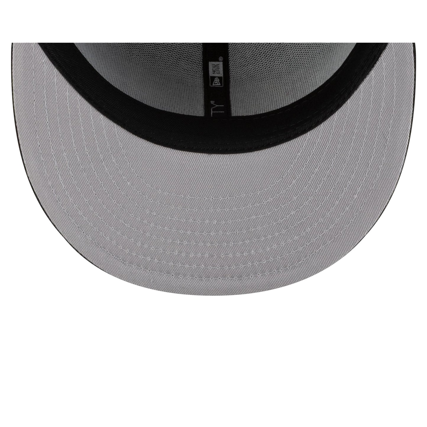 The Philadelphia 76ers 1963-1976 Hardwood Classics Poly Black 59FIFTY Fitted Cap features an embroidered vintage 76ers logo at the front panels with a 2002 NBA All-Star Game patch at the right-wear side. Additional details include a Hardwood Classics