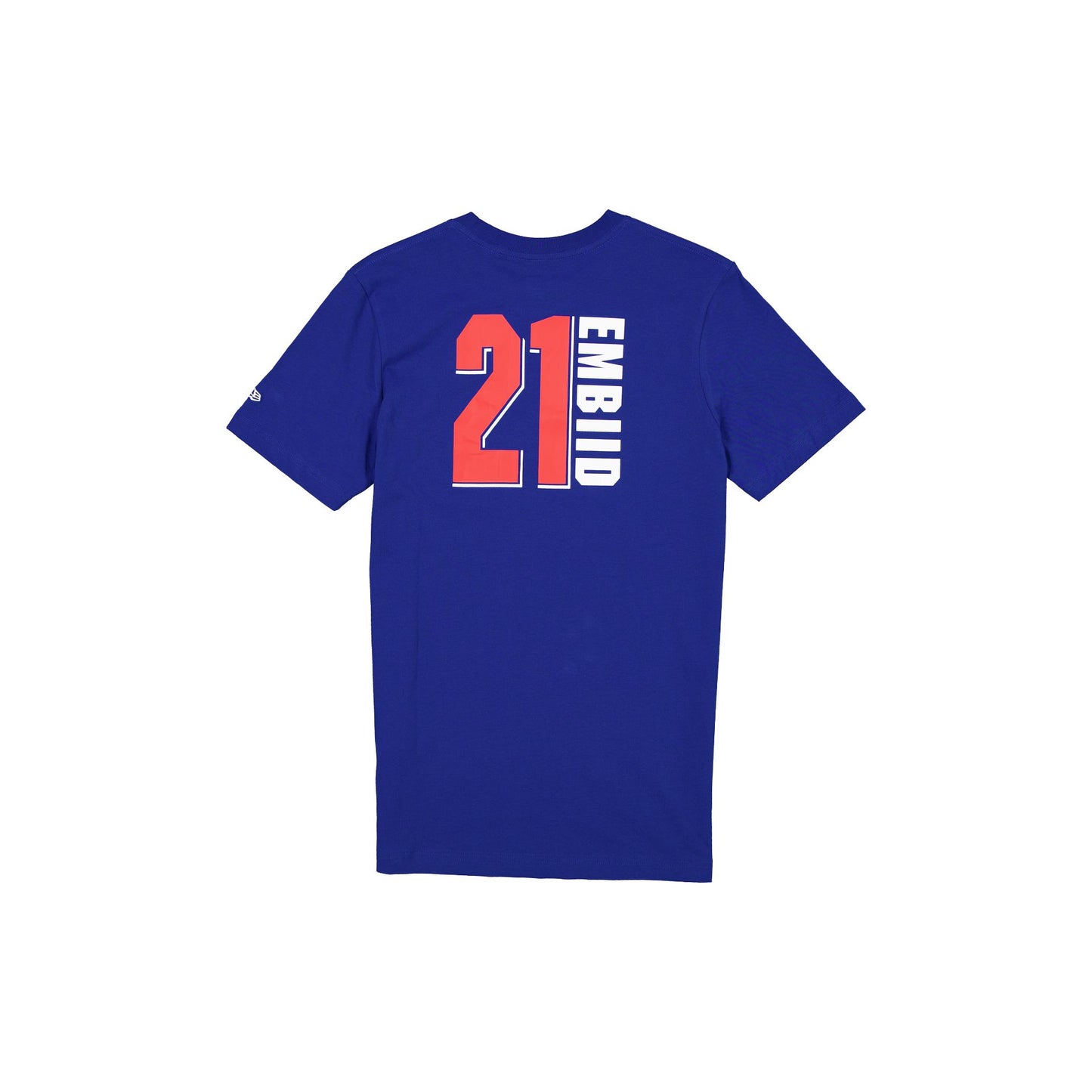 The Philadelphia 76ers Name & Number Joel Embiid T-Shirt features a screen-printed 76ers graphic at the front with the player's name and number at the rear.