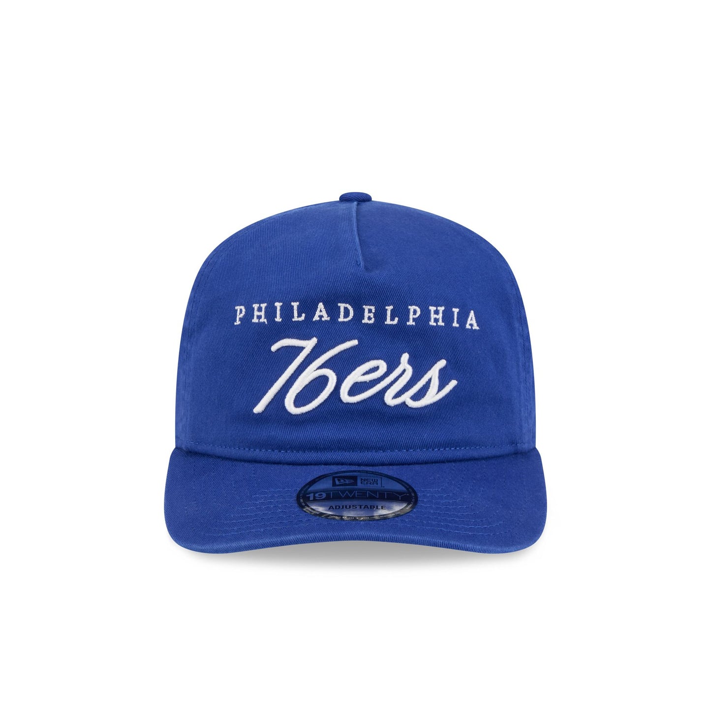 The Philadelphia 76ers Scripted 19TWENTY Adjustable Cap features an embroidered 76ers script wordmark at the front panels with a team logo at the right-wear side. Additional details include an adjustable snapback closure at the rear and a gray undervisor.