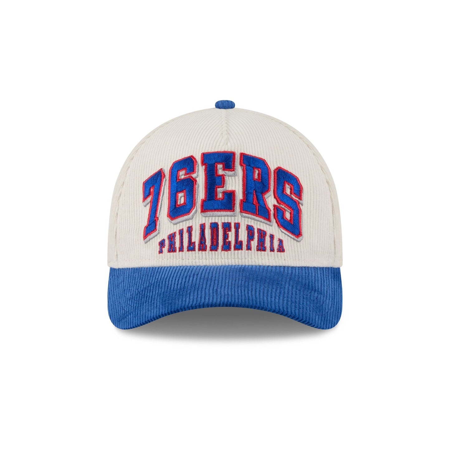 The Philadelphia 76ers Stacked Corduroy 9FORTY M-Crown A-Frame Snapback features an embroidered 76ers stacked wordmark at the front panels with a logo at the right-wear side. Additional details include a corduroy fabrication throughout, a snapback closure at the rear, and a gray undervisor.