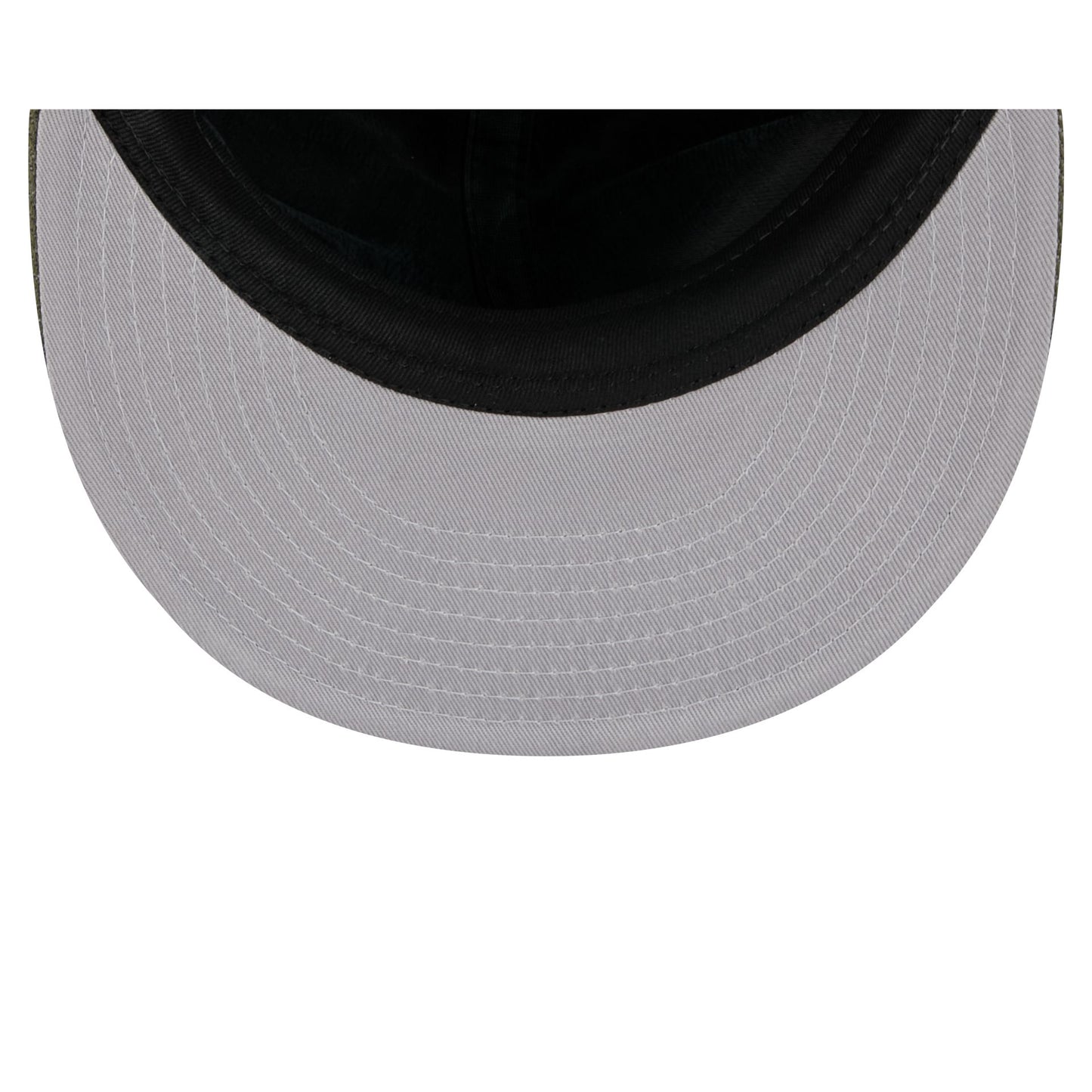 The Philadelphia 76ers Three Looms Cotton Twill Camo Retro Crown Dog Ear 59FIFTY Fitted features an embroidered 76ers logo at the front panels with a matching NBA Logoman at the rear. Additional details include fleece camo lined ear covers with a snap button closure and a gray undervisor.