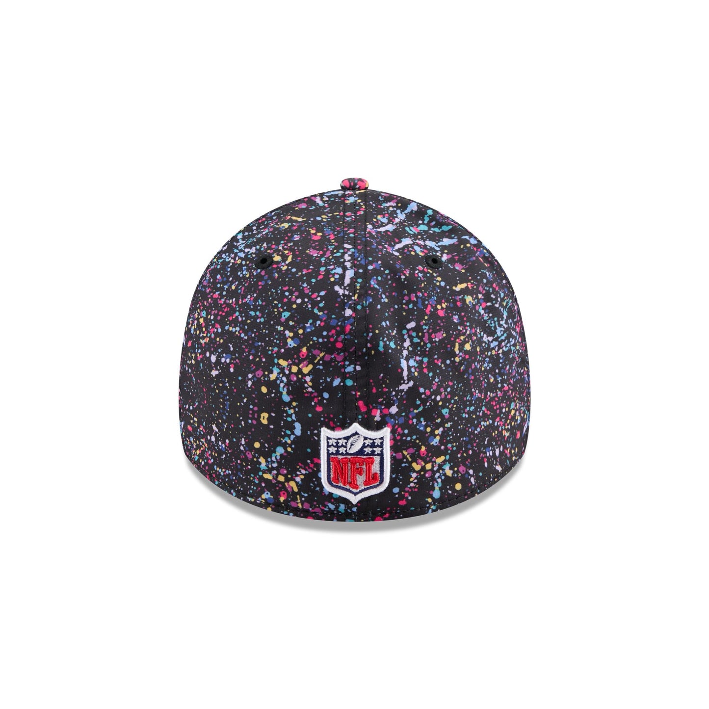 The Philadelphia Eagles 2025 Crucial Catch 39THIRTY Stretch Fit Cap features an embroidered Eagles logo at the front paint splatter panels with an NFL Shield at the rear, a Crucial Catch Intercept Cancer patch at the right-wear side, and a black undervisor.