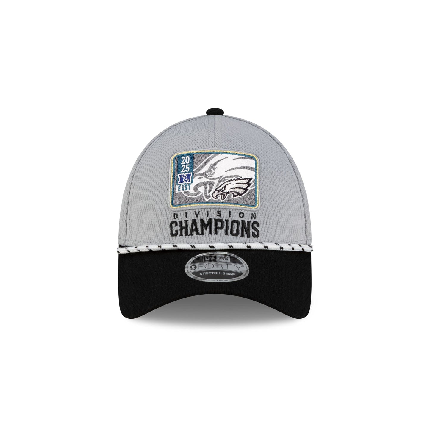 The Philadelphia Eagles 2025 Division Champion Locker Room 9FORTY Stretch-Snap Cap features an embroidered Eagles NFC East patch above a Division Champions wordmark at the front panels with an NFL Shield above a stretch-snap closure at the rear, a black visor, and a gray undervisor.