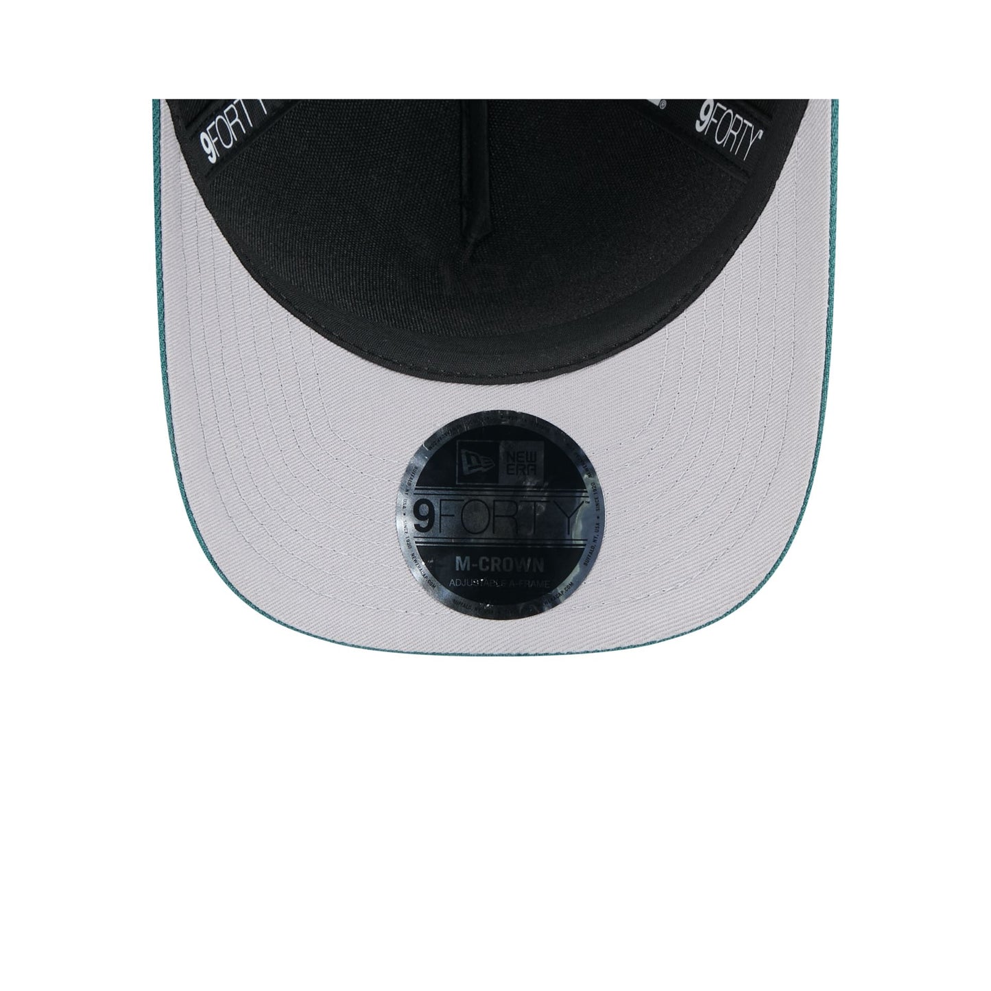 The Philadelphia Eagles 2025 Draft 9FORTY M-Crown A-Frame Snapback features an embroidered Eagles logo and wordmark at the front panels with an NFL Shield logo above a snapback closure at the rear. Additional details include ornamental stitched details at the visor and a gray undervisor.